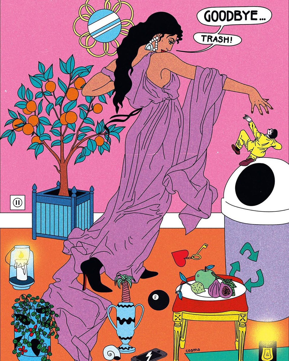 Le protagoniste delle illustrazioni sono quasi sempre giovani e affascinanti donne che vivono le loro avventure per strada o tra le mura domestiche in piena libertà, incuranti dei giudizi, difendendo strenuamente i propri diritti e quelli altrui. Talvolta irriverenti, ci osservano con sguardi conturbanti dalle stanze sfarzose di ville ottocentesche o da più modesti flat metropolitani. Conosciamole meglio, insieme a tutti gli altri abitanti dell’immaginario Cosmico, nella gallery che segue.