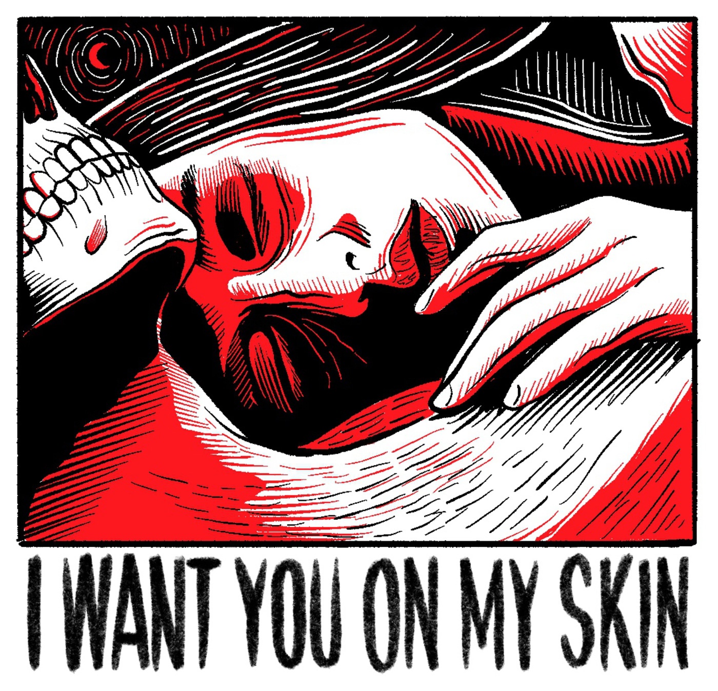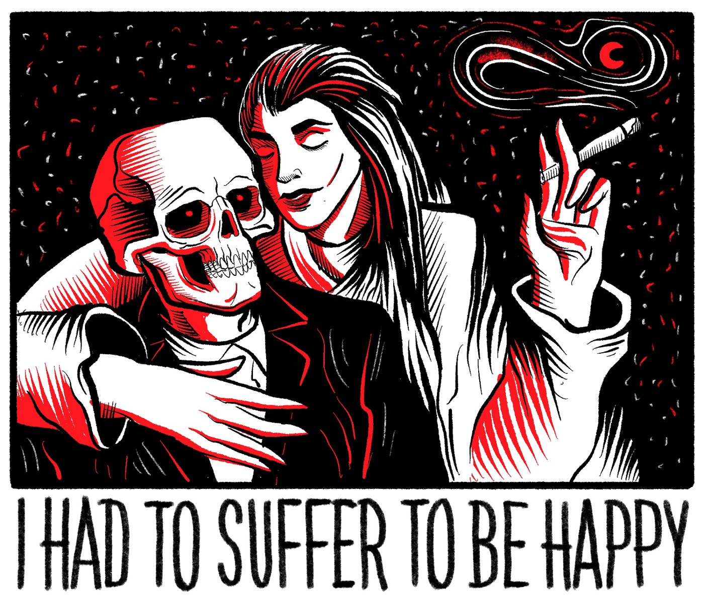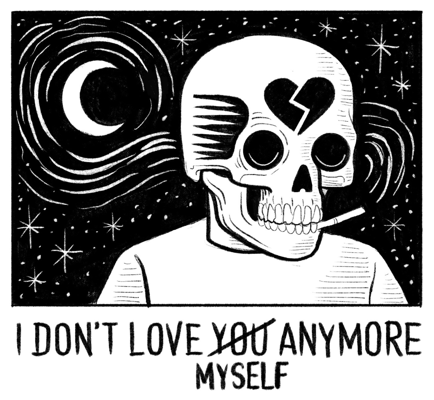 Il protagonista dei disegni di Daniele Vicentini è un personaggio controverso: uno scheletro col cuore spezzato, che fuma e beve. Un alter ego dietro la cui maschera va in scena lo scetticismo più schietto, una specie di Caronte “sputasentenze” che ci traghetta nelle pieghe più buie del nostro animo.