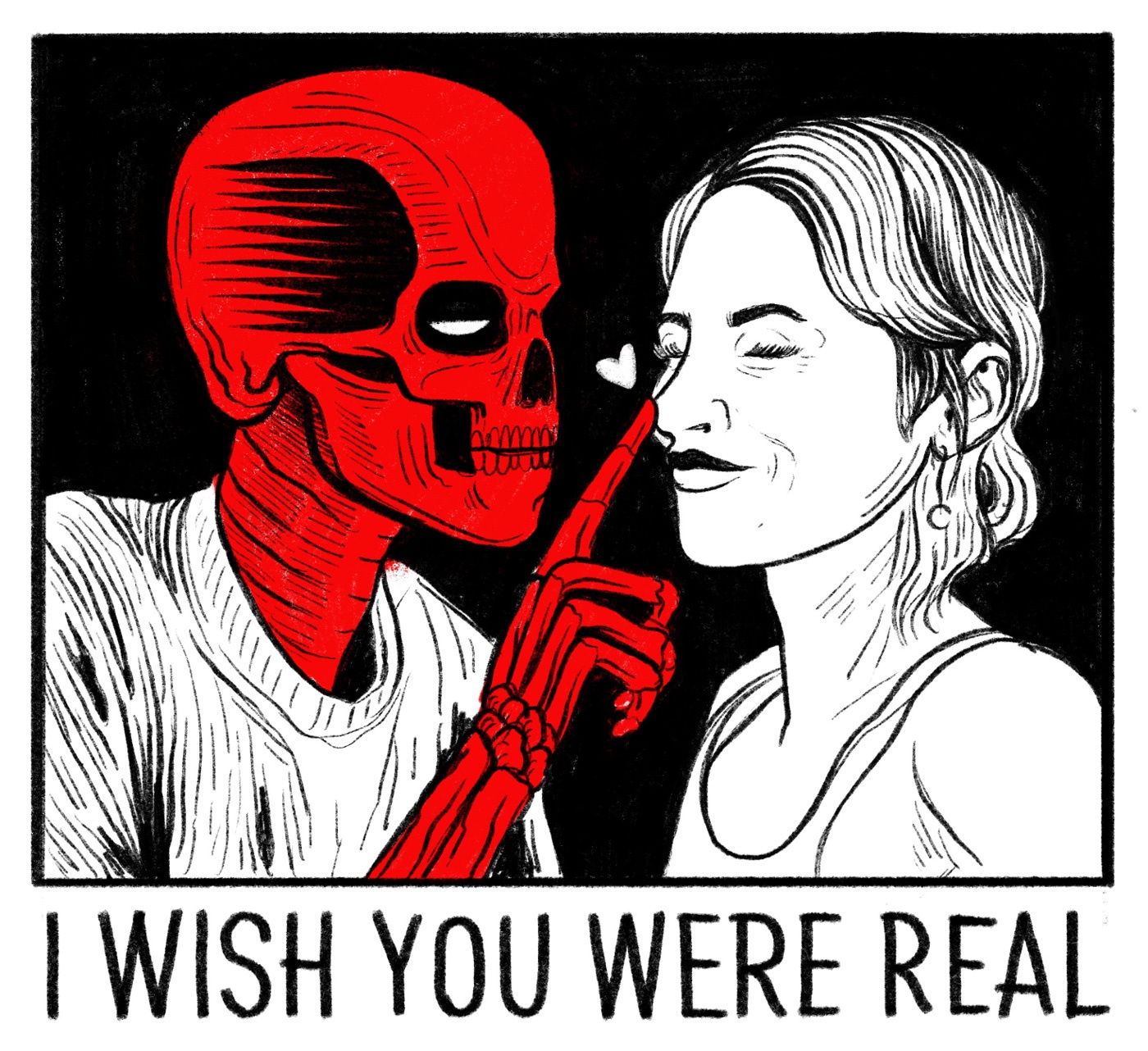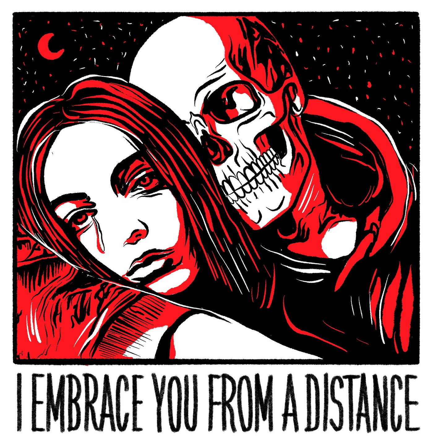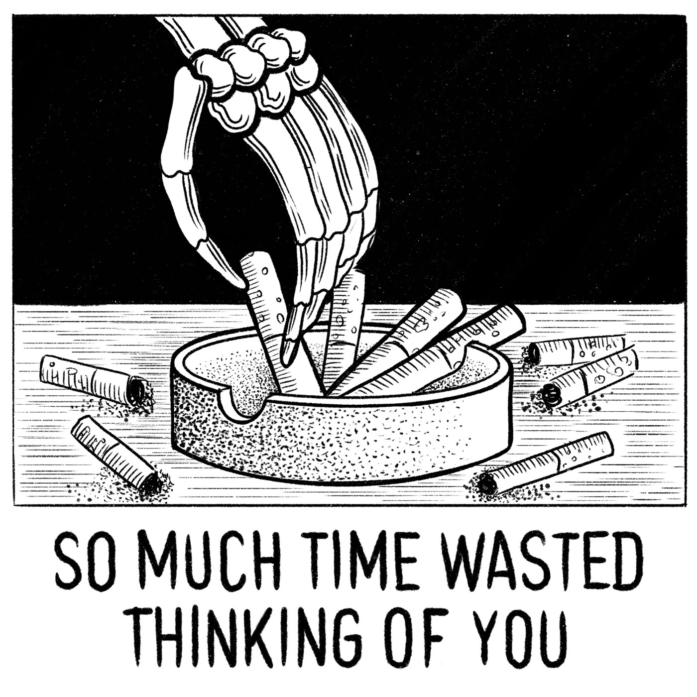 Il protagonista dei disegni di Daniele Vicentini è un personaggio controverso: uno scheletro col cuore spezzato, che fuma e beve. Un alter ego dietro la cui maschera va in scena lo scetticismo più schietto, una specie di Caronte “sputasentenze” che ci traghetta nelle pieghe più buie del nostro animo.