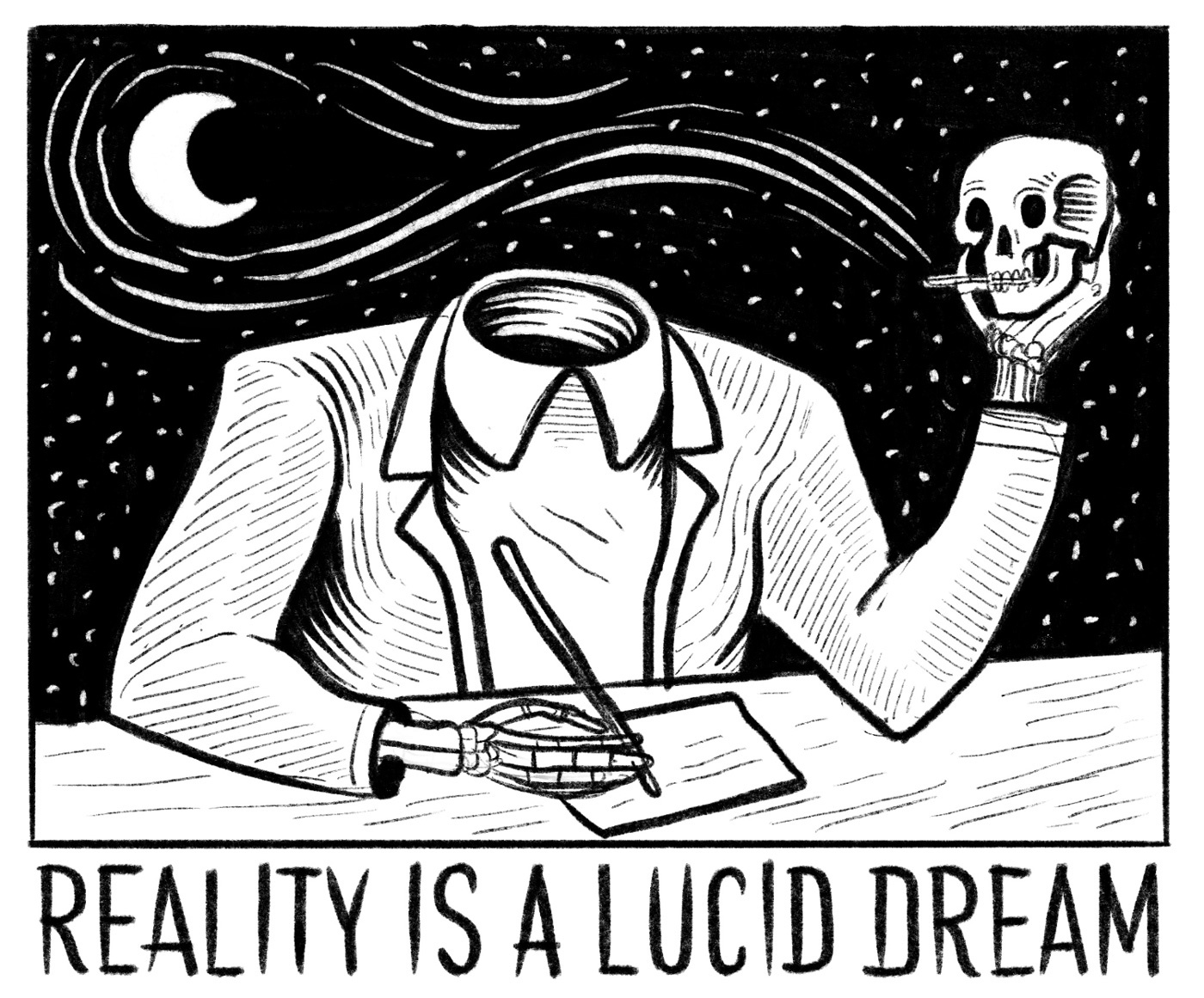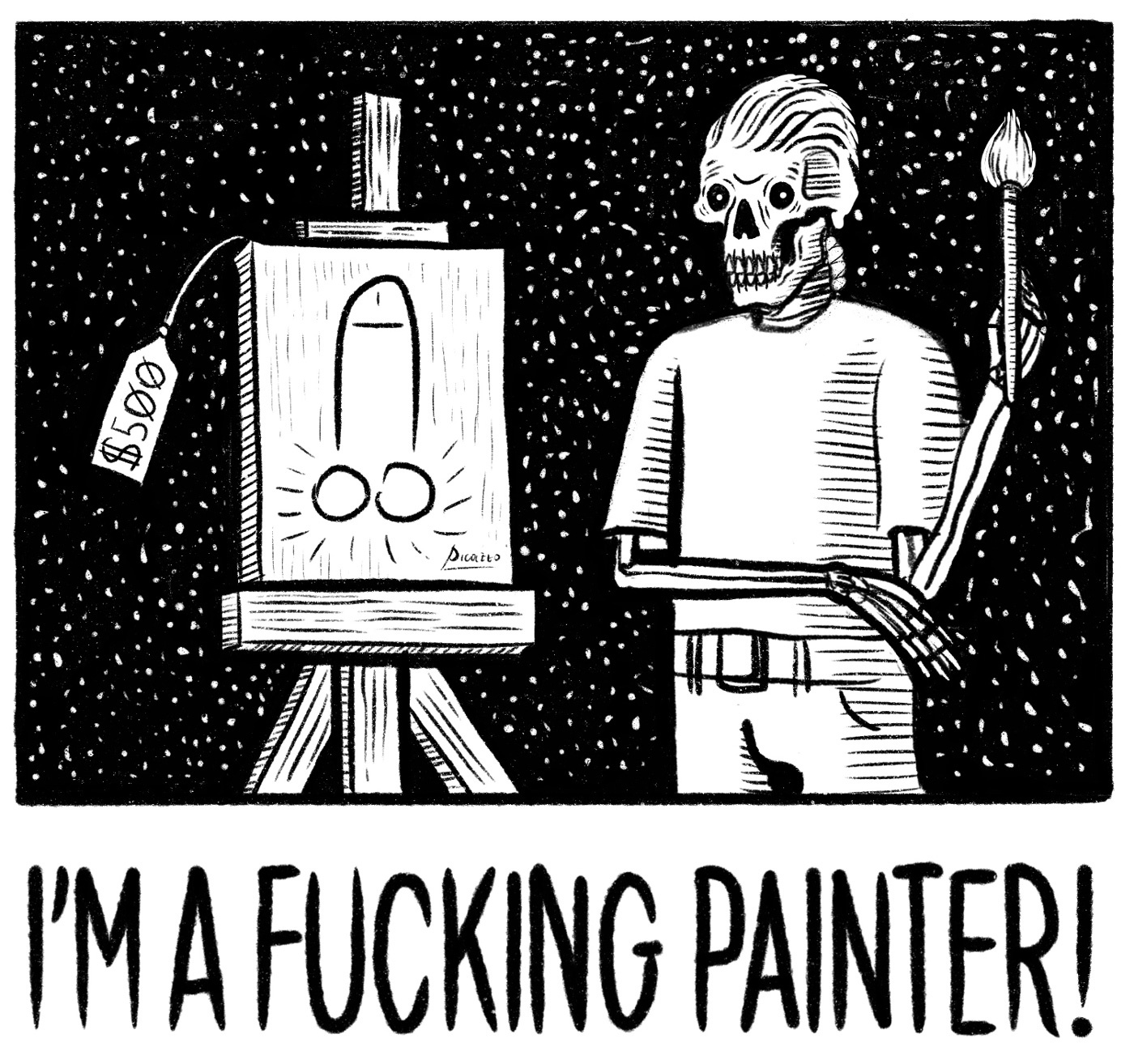 Il teschio è il classico monito figurativo del memento mori, utilizzato da sempre nell’arte per ricordarci la brevità della vita. In altri casi rappresenta lo spirito dell’uomo, la saggezza e l’annuncio di un cambiamento. Daniele utilizza quest’ultima accezione, aggiungendoci un tocco di ironia che tramuta ogni disegno in un aforisma illustrato che ci ispira un modo diverso di porci di fronte ai problemi esistenziali, spingendoci verso la positività. Tra i tanti un precedente storico illustre è sicuramente James Ensor, che dipingeva scheletri e maschere carnevalesche per criticare l’ipocrisia della società borghese del suo tempo.