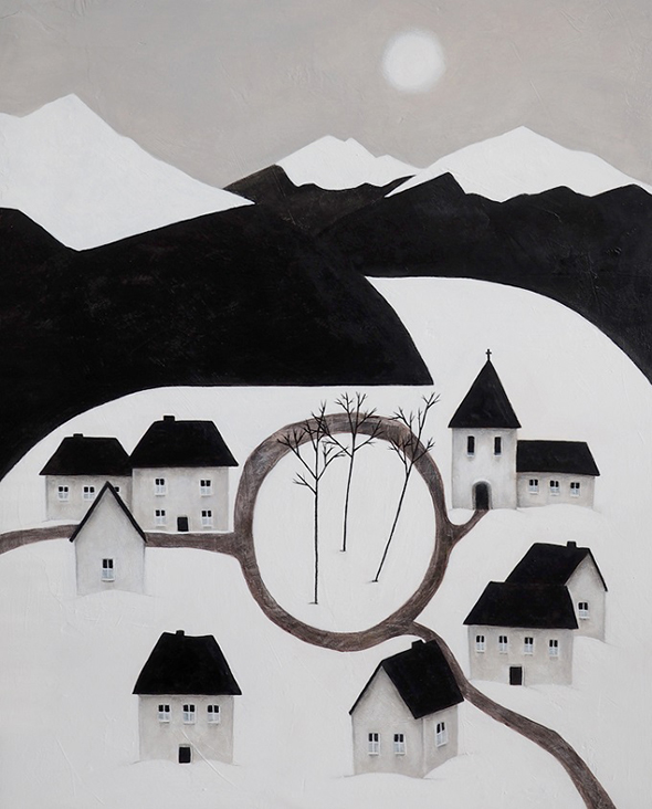 Mentre la biografia di Deb Garlick racconta di salti dalle rocce del Mediterraneo e di pipistrelli nelle caverne del Belize, il suo immaginario è fatto di neve ed alberi spogli, villaggi solitari ma ordinati, e di una palette colori essenzialmente minimale. Si avverte però dietro ad ogni immagine una storia iniziata, una vita che pulsa, un segreto non ancora svelato.