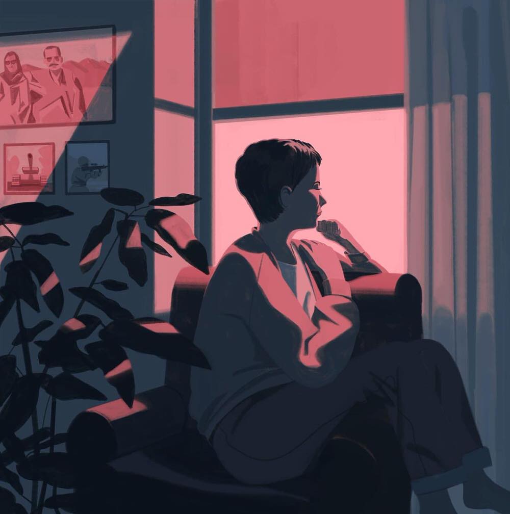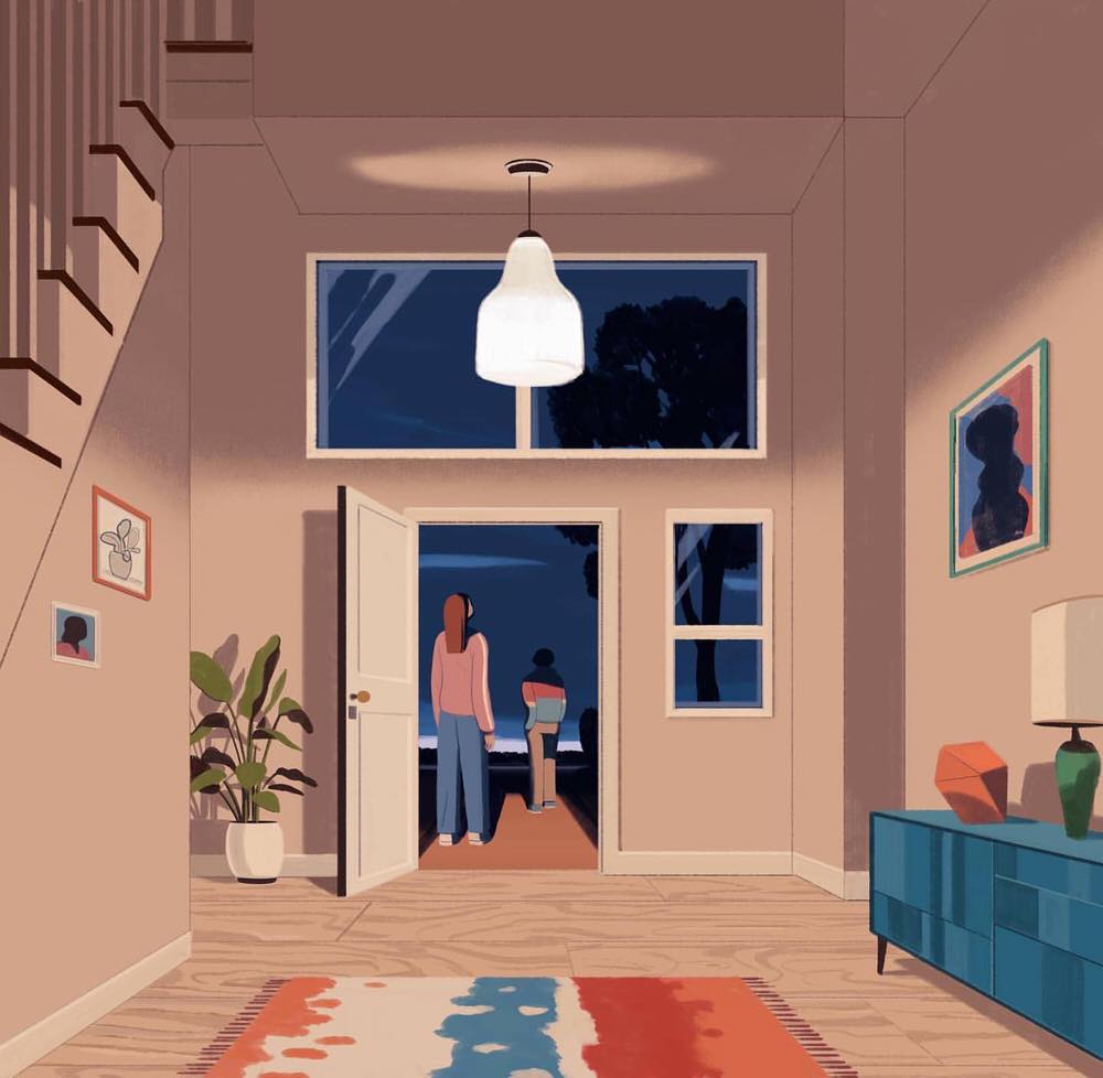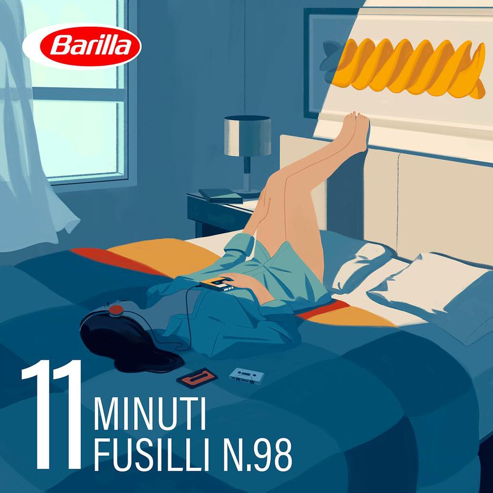 “Playlist Timer” è stata una splendida campagna pensata dal team di Prodigious. Ha vinto diversi premi a Cannes e sono molto contento di averne fatto parte. È uno di quei pochi esempi dove, anche in pubblicità, si riesce a creare progetti qualitativamente alti dove il prodotto è rappresentato ma non comprime l’aspetto illustrativo. Ad ogni illustratore è stato assegnato un tipo di pasta con un tempo specifico di cottura, quel tempo era la durata di una playlist su Spotify. Uno splendido concept dove l’attesa per la cottura della pasta viene accompagnata dall’ascolto di uno o più brani. Terminata la playlist è ora di scolare la pasta. Il mio brief era “Timeless Emotion Fusilli”: ho virato l’aspetto emotivo utilizzando la luce e lo sguardo della ragazza rivolto alla finestra aperta come ad immaginare un ricordo ascoltando un pezzo con il Walkman. Tutto è orientato verso gli anni ’80. La composizione è pensata perchè si vedano al contempo sia la parte in ombra della ragazza, con le cassette e il mangianastri, sia la parte bassa, attraverso la linea del corpo, con le gambe che portano al quadro sulla testiera del letto.