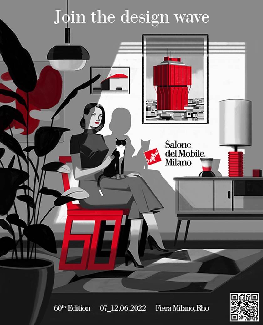 Illustrazione per il 60° anniversario del Salone del Mobile. Il progetto è formato da sei locandine, in uscita ogni mese da febbraio a giugno 2022, ciascuna dedicata ad un decennio del design italiano dagli anni ’60 ad oggi