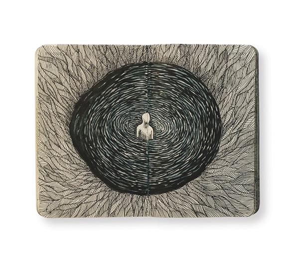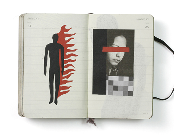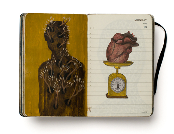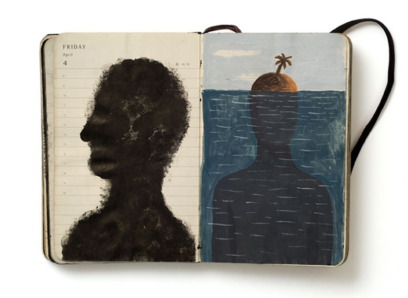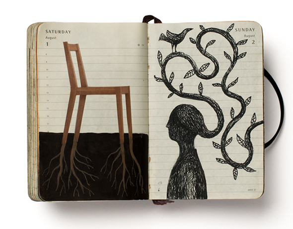 Tra i suoi molti lavori voglio segnalarvi il Diario Visual, un progetto nato per gioco nel 2007, che lo stesso Pep Carrió definisce un libro-mostra: un’agenda, un disegno al giorno che fissa sensazioni e idee. Spesso è una palestra per l’inconscio, con immagini create in modo quasi automatico: “All’inizio nel diario c’erano molti collages, poi, a mano a mano, il disegno prese il sopravvento e diventò quasi l’unico mezzo espressivo. Il disegno ha una grande capacità espressiva, ti mette a nudo“.