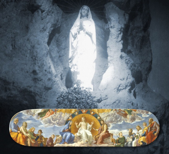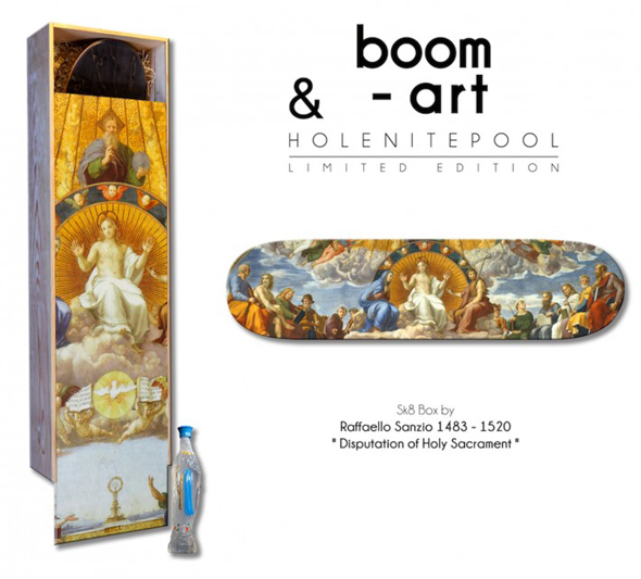 Raffaello Sanzio si sarebbe potuto immaginare di tutto ma non certo che una delle sue opere (la “Disputa del Sacramento“, celeberrima opera del Nostro risalente al 1510) fosse riprodotta su una tavola di legno dotata di ruote. Il packaging comprende una bottiglia di acqua di Lourdes a forma di Madonna. Un’idea di Boom-Art.