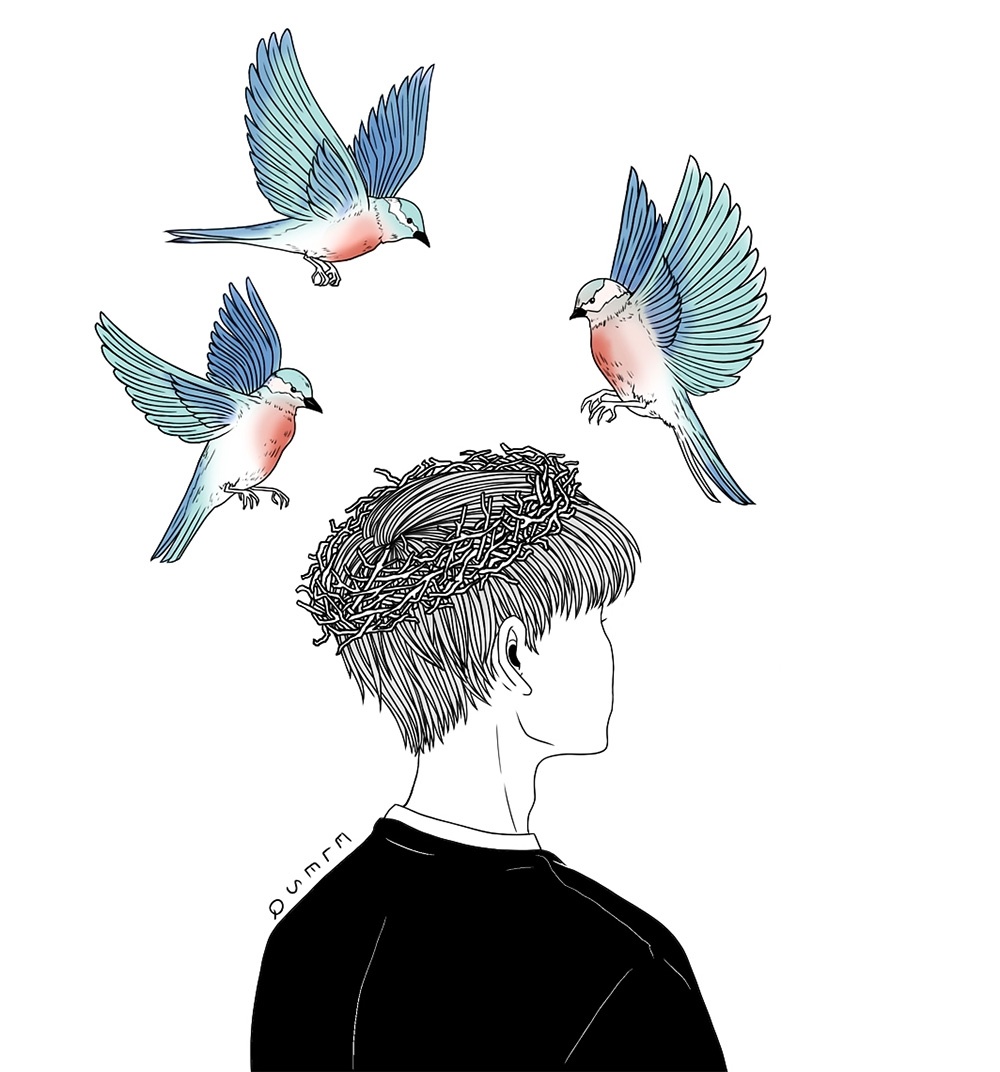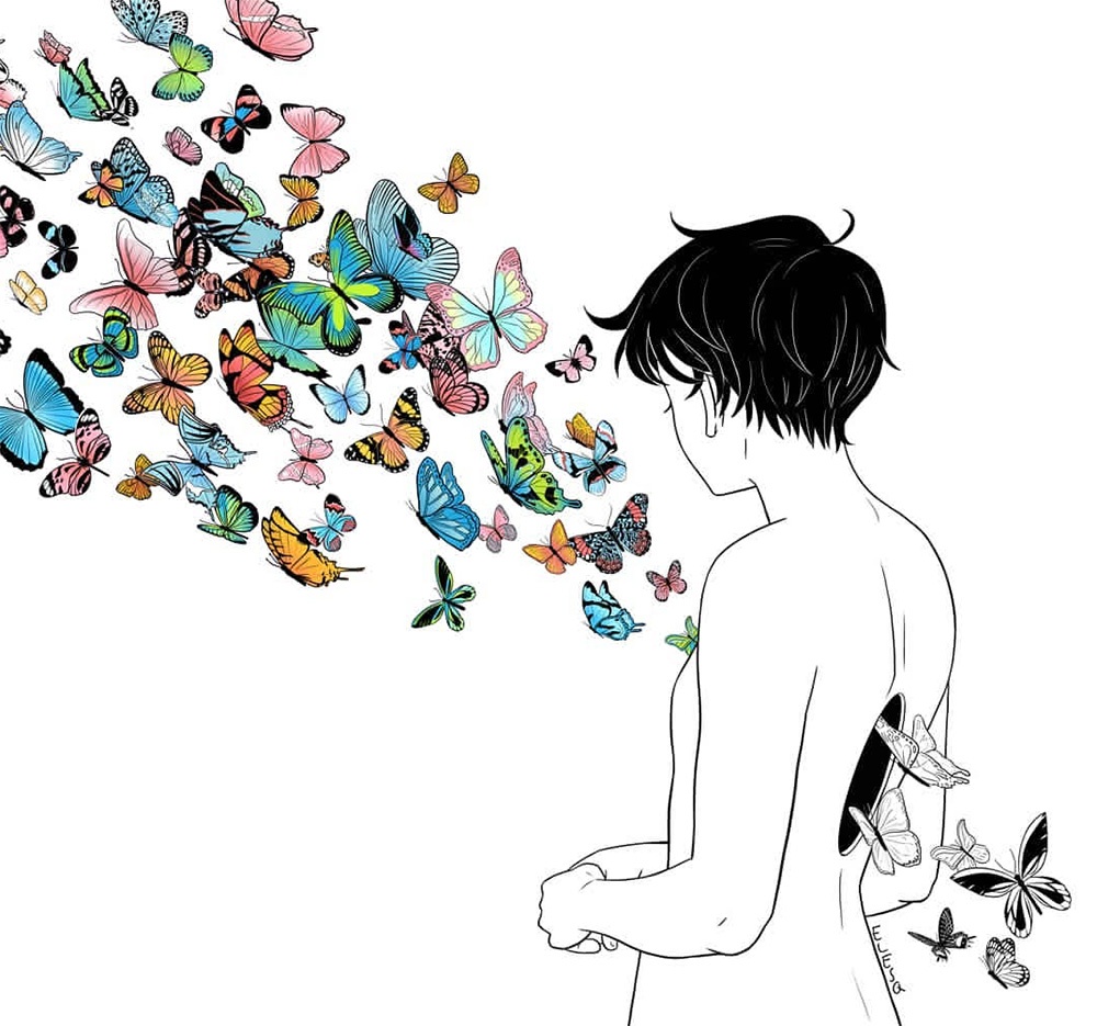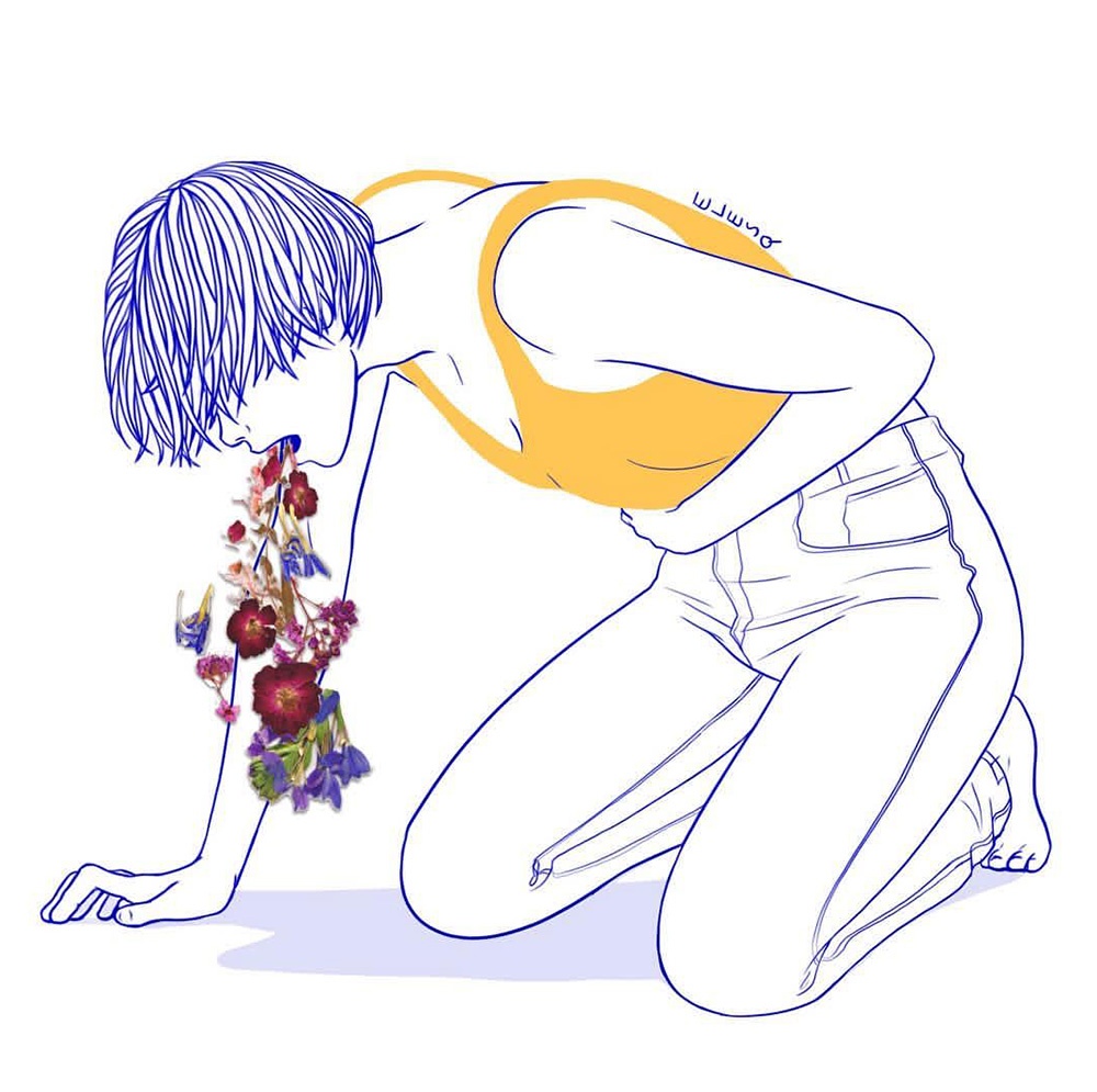 La carica emotiva vissuta in prima persona attraverso i giovani personaggi dei suoi disegni è evidente, ma viene filtrata e stilizzata dalla riflessione, trasformando il caos dei sentimenti in metafore universali nelle quali ci possiamo riconoscere tutti. Uno dei disegni-simbolo che meglio esprime questo suo stile è lo stesso scelto dall’artista come immagine del profilo Instagram: una ragazza dal cui capo emerge in tutta la sua potenza un mare in tempesta.