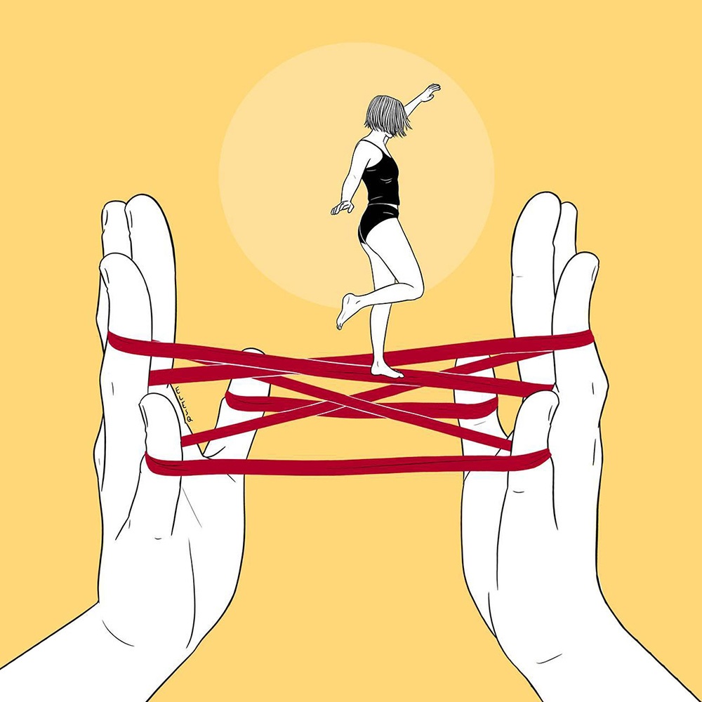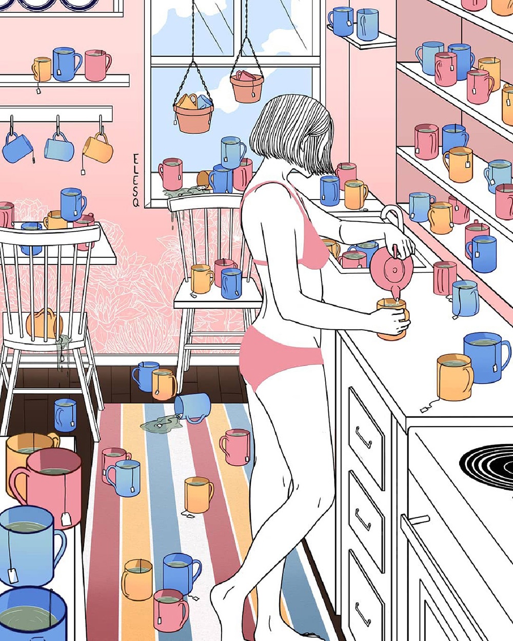 Le illustrazioni di Elliana Esquivel sono un interessante sintesi di contrasti. Il suo è un tratto pulito e preciso, quasi rassicurante, che in realtà taglia come un bisturi, dissezionando l’anima e mettendo in mostra ansie, insicurezze e sentimenti.