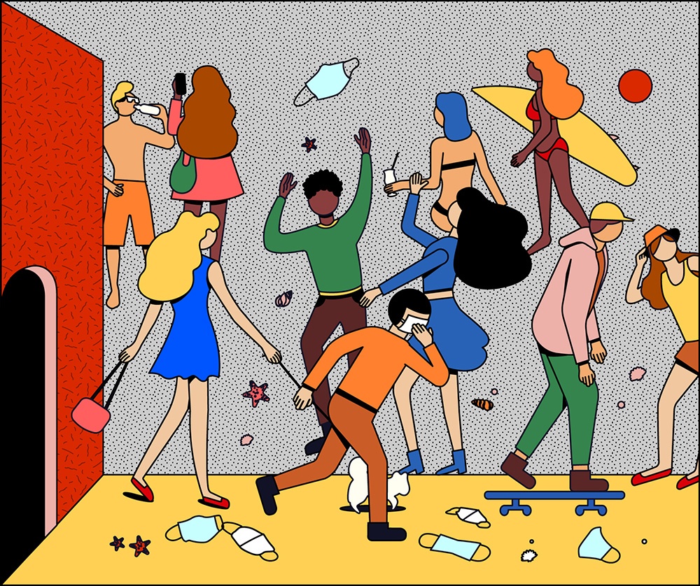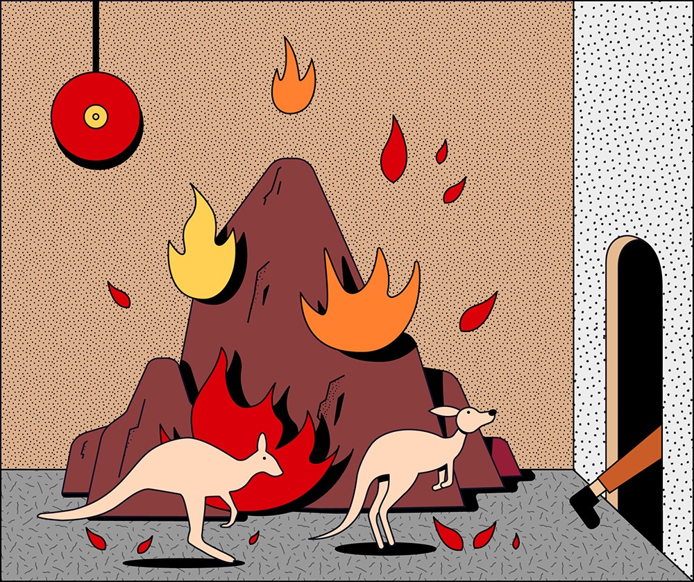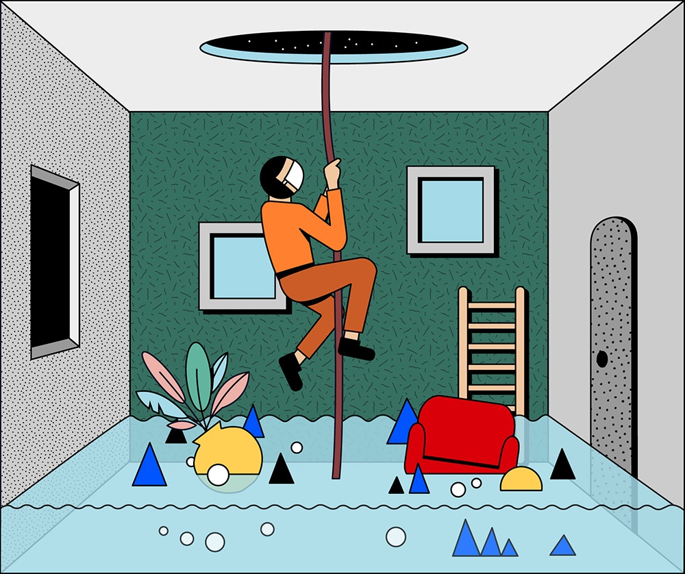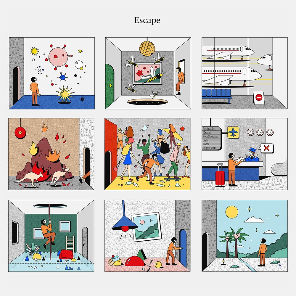 Questo stato d’animo collettivo ha fornito a Simo Liu, illustratrice di Los Angeles, la motivazione per creare la propria visione della realtà e per inviare un messaggio di speranza attraverso l’illustrazione. Il progetto che ne è derivato, “Escape“, è una sequenza di nove tavole: otto di esse riassumono i più disastrosi avvenimenti dell’ultimo anno; l’ultima, la più importante, è una finestra aperta sulla speranza, su un futuro in cui si potrà nuovamente camminare liberamente per le strade, col sole negli occhi e il vento che ci sferza il viso.