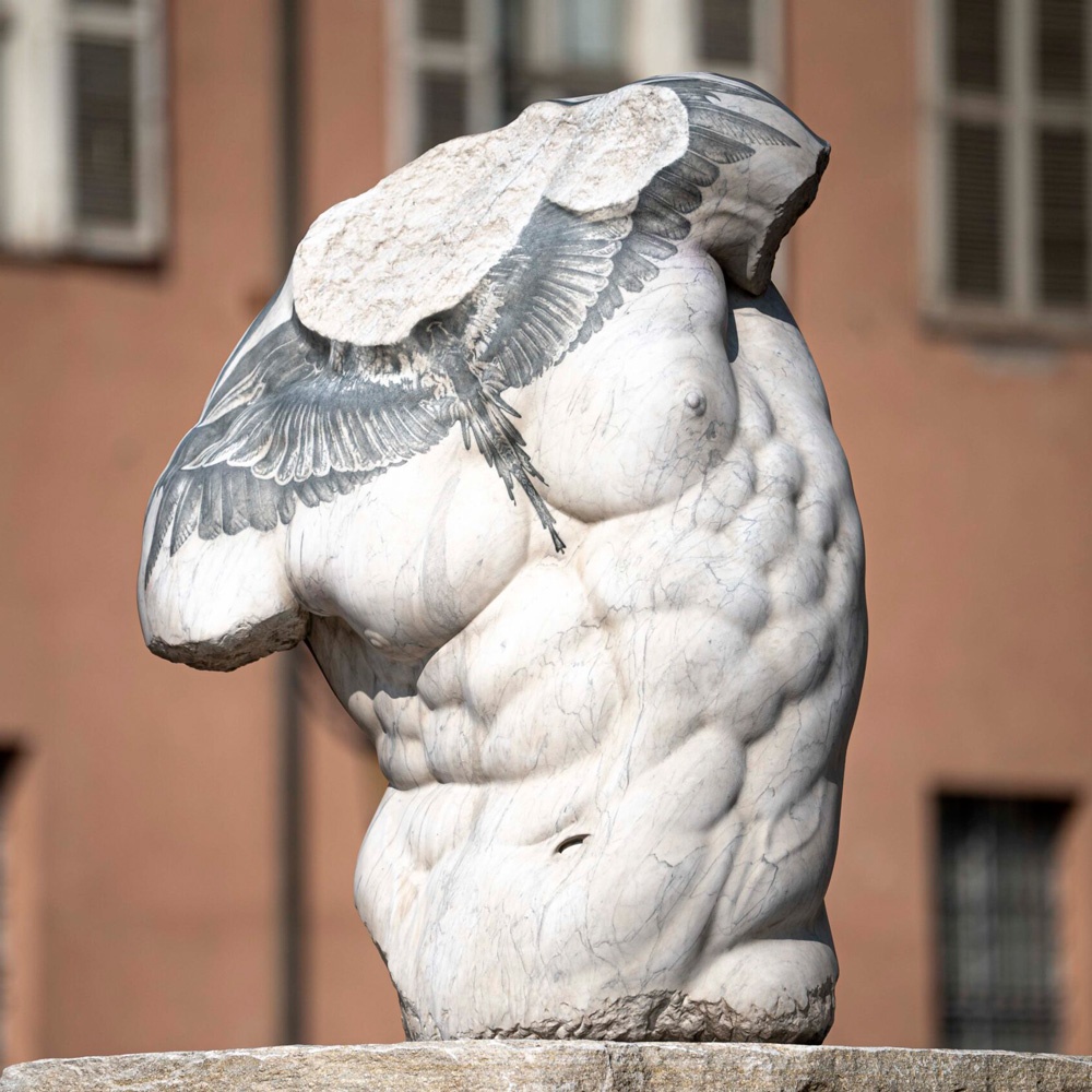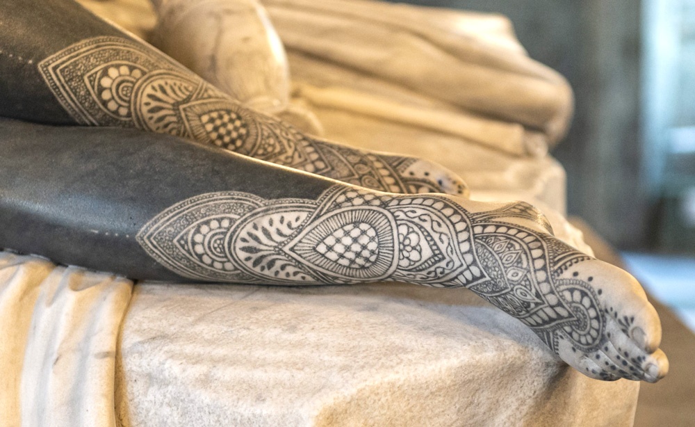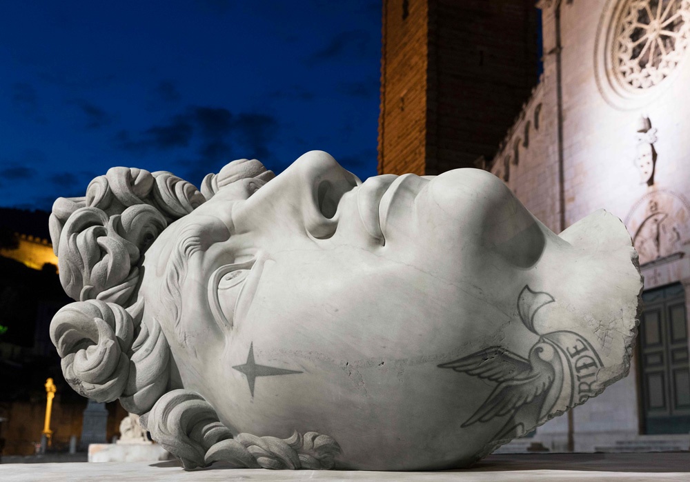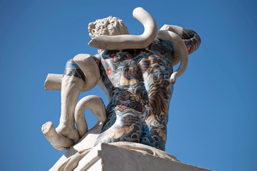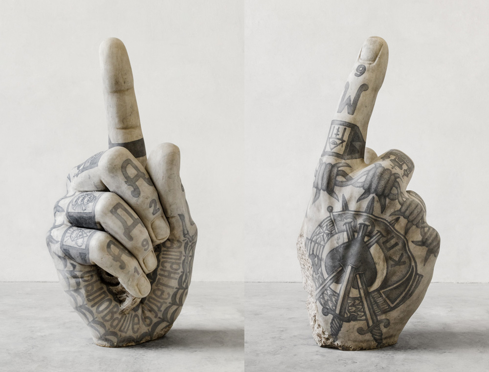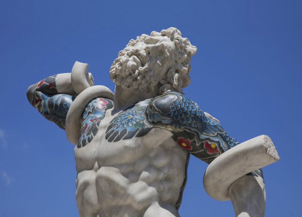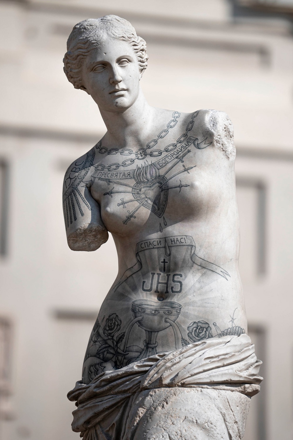 I ready-made di Viale sono sculture classiche coperte di tatuaggi che, come un viaggio nel tempo fino al nostro presente, trasformando le icone artistiche in simboli universali che possiamo sentire più vicini a noi.