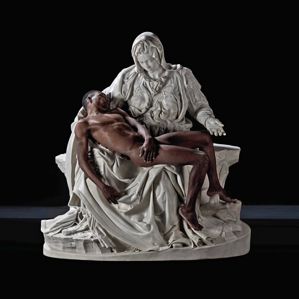 Souvenir Pietà (Cristo) è la riproduzione del solo corpo del Cristo, separato dalla madre dell’originale michelangiolesco, ed esposta a Torino nella Cappella della Sindone. Questa collocazione crea un effetto di sacralità unico nel suo genere, anche per chi, come Viale, non è credente. L’altra parte del celebre gruppo scultoreo, ovvero Souvenir Pietà (Madre) è stata la protagonista dell’installazione Lucky Ehi, nella quale un giovane migrante nigeriano prende il posto del Cristo.