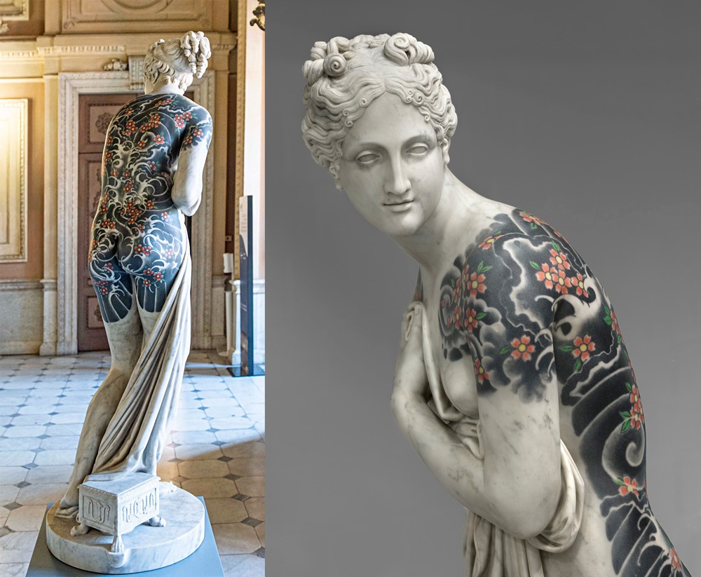Fabio Viale ha spiegato che il tatuaggio sulla Venere Italica, altra opera del Canova, riproduce il fiore di ciliegio, usato dagli appartenenti alla Yakuza giapponese per rappresentare il proprio coraggio. Un’altra commistione di estremi, in questo caso tra la bellezza classica e i segni tribali della criminalità contemporanea.