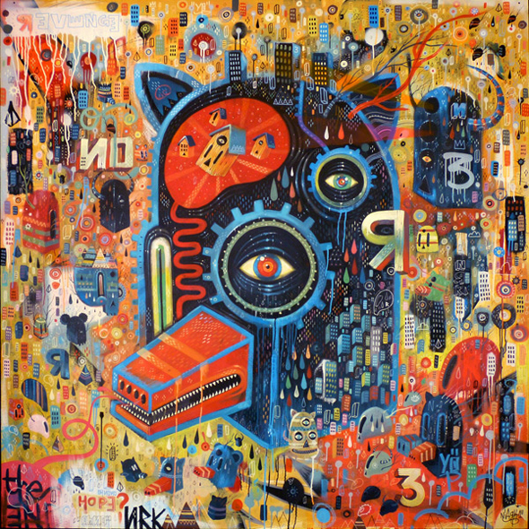 Un universo con una moltitudine di ispirazioni, dai film horror a quelli di David Lyhnch, da Basquiat al Cubismo passando per i graffiti e la street art, dove demoni e fantasmi con origini indiane, africane e cinesi si fondono con le forme geometriche e con la spazialità del foglio. Lavorando principalmente con acrilici, l’applicazione del colore ed il metodo che usa per definire le sue superfici sono uniche. L’artista taglia e incolla le strisce di giornale per poi stratificarle sulla tela e coprirle con la vernice per dare alle tele la profondità desiderata. Il risultato è un lavoro così ricco di informazioni che proprio quando si pensa di aver visto tutto, in un angolo nascosto, si scoprono sempre nuovi elementi.