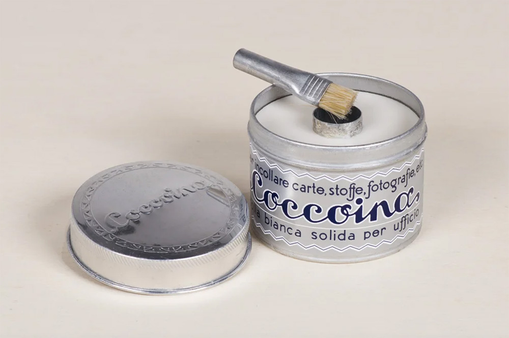 Coccoina, colla al profumo di mandorla per carta, stoffa, uso fotografico, Voghera (Pavia), dal 1927