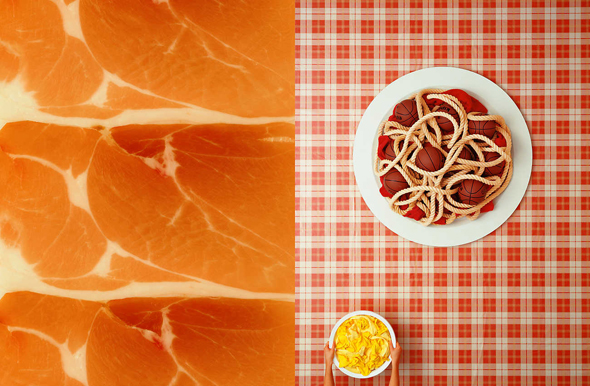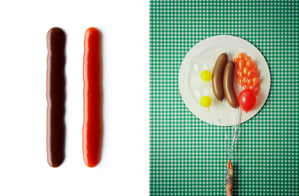 Sbizzarrirsi prendendo spunto dal cibo, che non è dunque sempre fatto per essere mangiato, è ormai un fenomeno gettonatissimo. Gli spazi scelti da David Sykes diventano luoghi folli e creativi dove poter lavorare. Pareti sistemate come tovaglie sulle quali potersi cibare di… attrezzature da palestra agrodolci? Croccanti palloncini colorati? Asciugamani alla griglia? L’idea è il fast food di Faux Food.