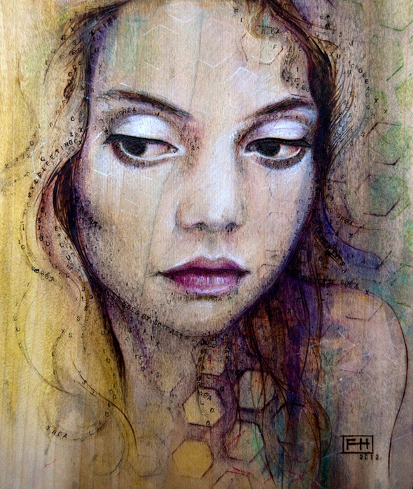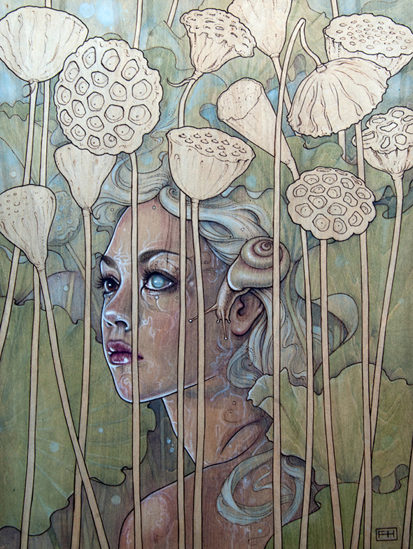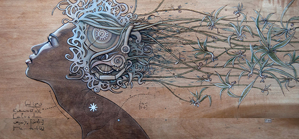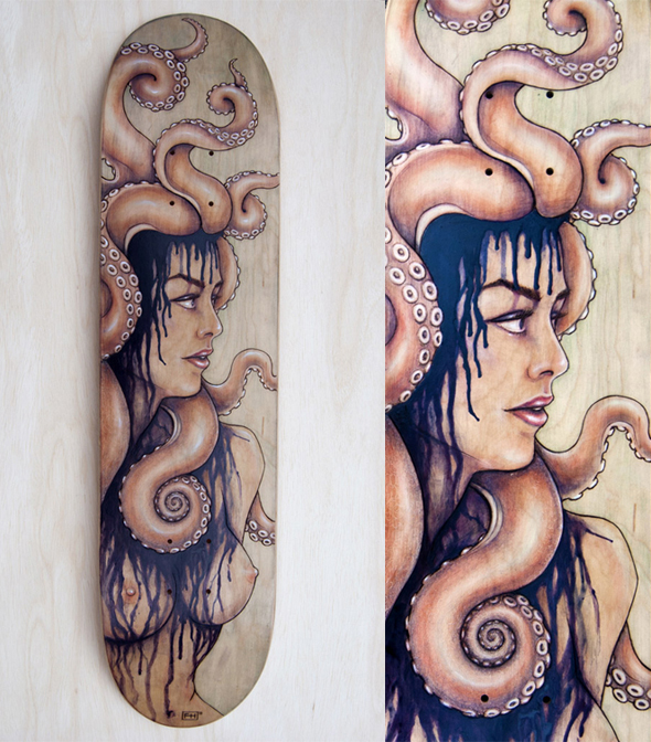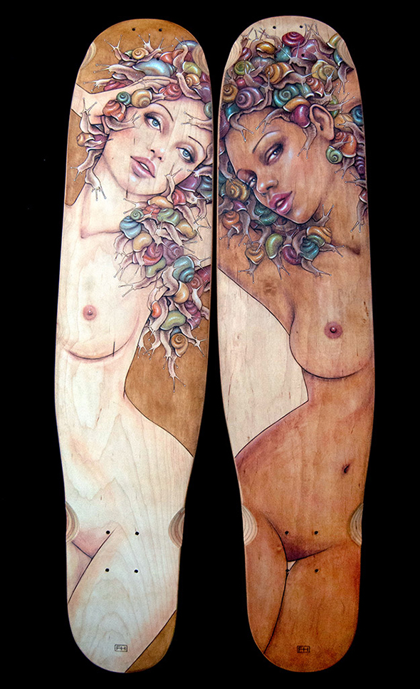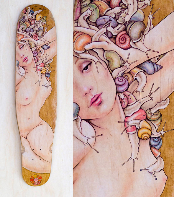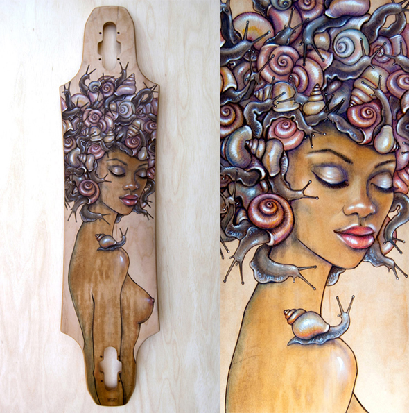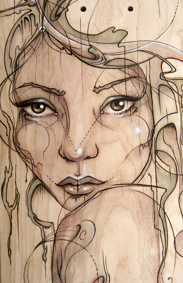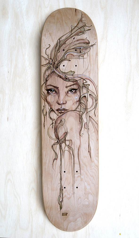 Fay Helfer, originaria di Saint Martin, è un’artista che stupisce per le sinuose donne dai capelli di lumache incise sugli skateboard, per l’anatomia dei vegetali e per le tavole dedicate al Trono di Spade. Ma in particolare modo, Fay si distingue per la scelta di abbinare alla pirografia, l’utilizzo di pigmenti colorati che crea personalmente. Frutta e vegetali, come cipolle rosse, mirtilli e barbabietole, sono la materia prima che colorano le sue opere, un connubio singolare che esalta e impreziosisce ancor di più il suo lavoro.