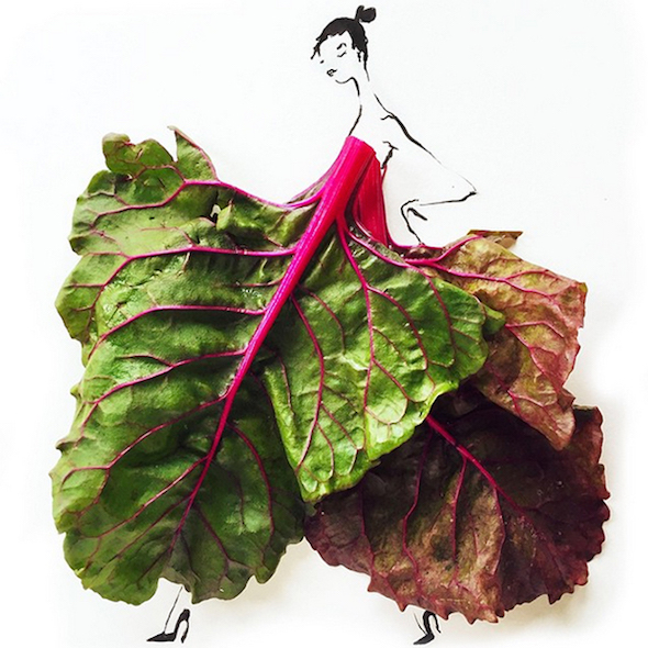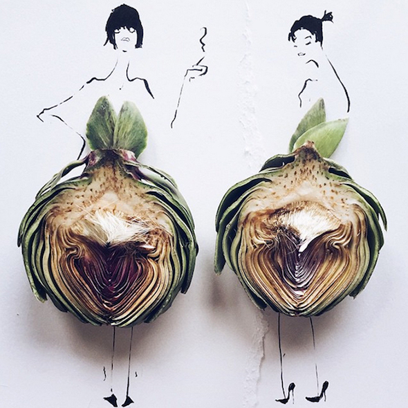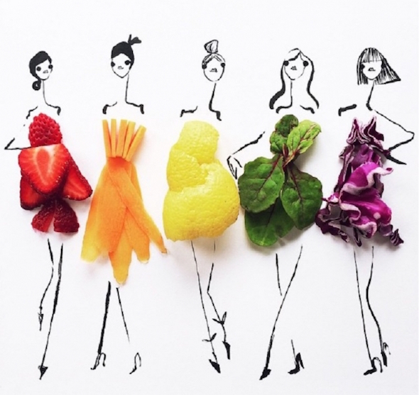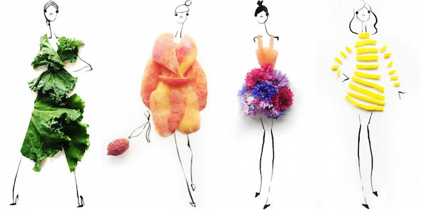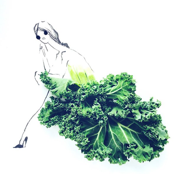 Cucina e moda sono mondi che non si incrociano molto spesso, e ancora più raramente accade che ad accomunarli sia l’illustrazione. Anzi, direi che il caso di Gretchen Röehrs è unico. Illustratrice americana e product designer, probabilmente non ha mai dato ascolto alla mamma che le diceva di non giocare col cibo, e ha fatto la cosa giusta. Le sue figure femminili, stilizzate al punto di essere appena accennate, reinterpretano le creazioni haute-couture di Givenchy, Jason Wu, Sonia Rykiel, trasformandole in verdure, frutta, uova, e sublimandole. C’è del genio.