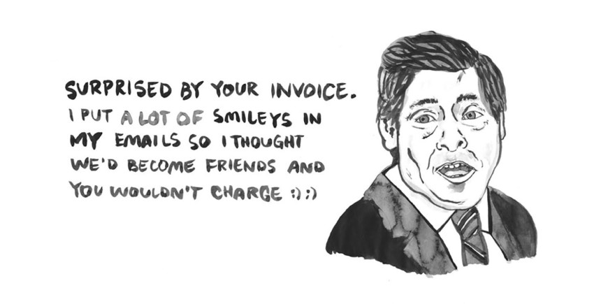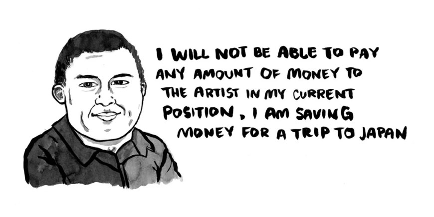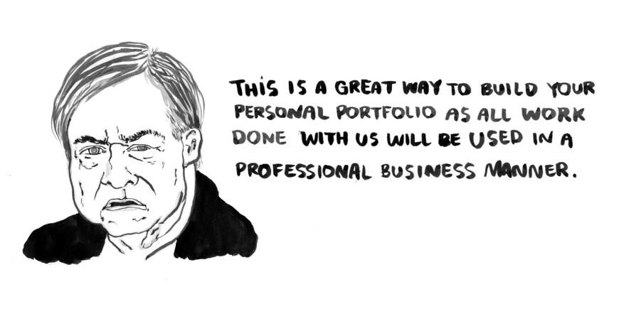 L’ultima brillante reazione in ordine di tempo è stata pubblicata da Format Magazine, che ha commissionato ad Emmie Tsumura una serie di illustrazioni basate su @forexposure.txt, un account Twitter che raccoglie “richieste reali di gente reale che vuole farti lavorare per la visibilità”. Tsumura, che ha già nel suo portfolio una sterminata serie di facce da Tinder, immagina le persone nell’atto di proferire le nefande parole, con risultati impagabilmente (tragi)comici.