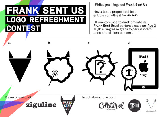I Frank Sent Us cercano qualcuno che sia in grado di rivisitare, senza stravolgere, di rendere attuale e contemporaneo il loro logo. Qualcuno che sappia renderlo attuale, ma con memoria del passato. Quindi, ecco un bel contest per dare libero sfogo alle matite e ai mouse di grafici e artisti. Il vincitore si becca un iPad da 16GB e un sacco di gloria. Su ziguline trovate tutte le info per partecipare… deadline 5 aprile!