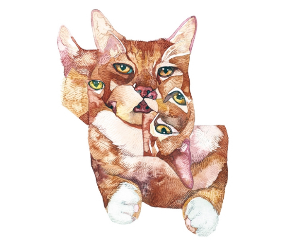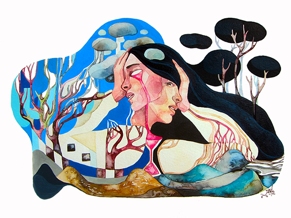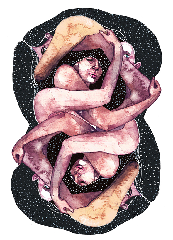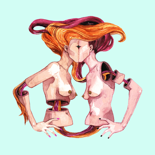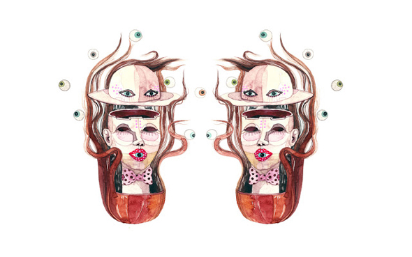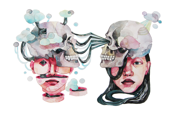 Vive a Baltimora ma viene dalle Filippine, Gel Jamlang è un’illustratrice e visual artist che usa i contrasti che gli acquerelli creano naturalmente per dare una matericità surreale ai suoi lavori. I soggetti sono scomposti su diversi livelli ed è soprattutto sui ritratti che l’operazione svela il suo fascino. I volti sono moltiplicati, a volte specchiati, altre volte invece si riflettono come fossero facce di un prisma, creando ripetizioni e ridondanze di segni che sembrano voler parlare della pluralità intrinseca di ogni singolo individuo mantenendo, però, un senso ironico e giocoso.