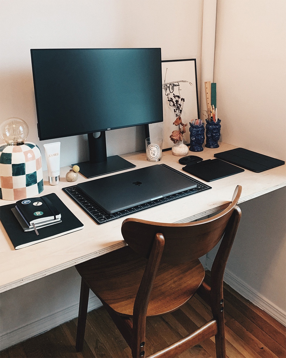 Innumerevoli dispositivi elettronici, due Teste di Moro da Noto adibite a porta penne, crema per le mani, taccuini vari, una stampa di Alex Katz, una candela che mi ricorda casa, fiori secchi in un vasetto acquistato per $3 a un mercatino di Philadelphia anni fa, e una lampada fatta a mano da un artista che mi piace.
