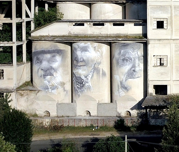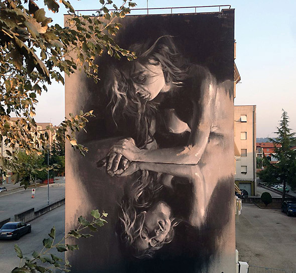 I rimandi al barocco sono inevitabili, non solo per via dei soggetti rappresentati, ma anche per l’uso ricorrente della luce e dei chiaroscuri, che nella scala urbana riescono a sortire un impatto notevole e una reazione di stupore nel passante occasionale. Peculiarità dei suoi lavori sono anche piccoli testi, a volte anche solo singole parole, che lo street artist di Caracas tiene a includere nell’opera, quasi a completarla e a solleticare lo spettatore nella sua interpretazione.