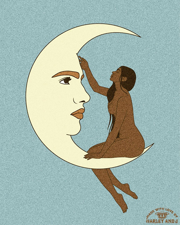 Fiori, colori psichedelici e giovani innamorati fanno sembrare le illustrazioni di Harley&J dettagliate rappresentazioni dei prati di Woodstock del 1969. Del resto è la stessa artista australiana, al secolo Jasmin Meier, a dichiarare di ispirarsi liberamente ai poster musicali dell’epoca e alla cultura dei figli dei fiori. Nei suoi disegni, realizzati a mano e poi finalizzati al computer, elementi geometrici e figure umane si mescolano ad una simbologia fatta principalmente di fiori, farfalle, occhi, arcobaleni e scritte realizzate con font tondeggianti e deformati tipici di quegli anni.