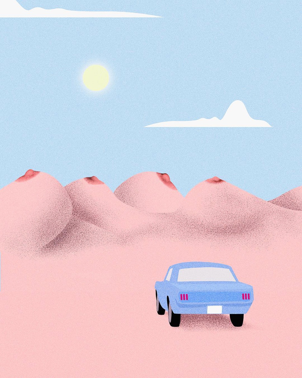 Un tocco di ironia: il corpo femminile con le sue forme diventa pendio, roccia da scalare, splendido panorama.