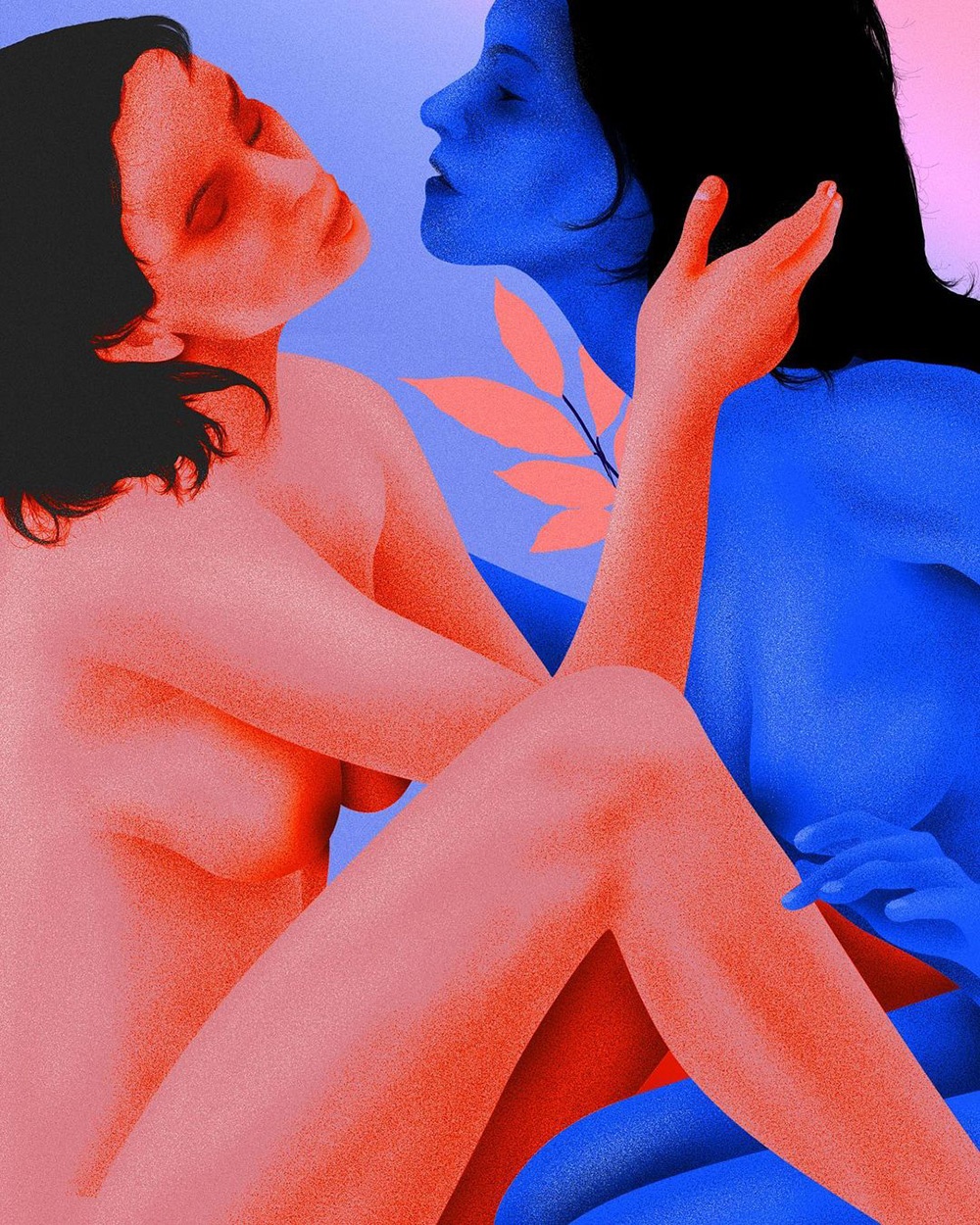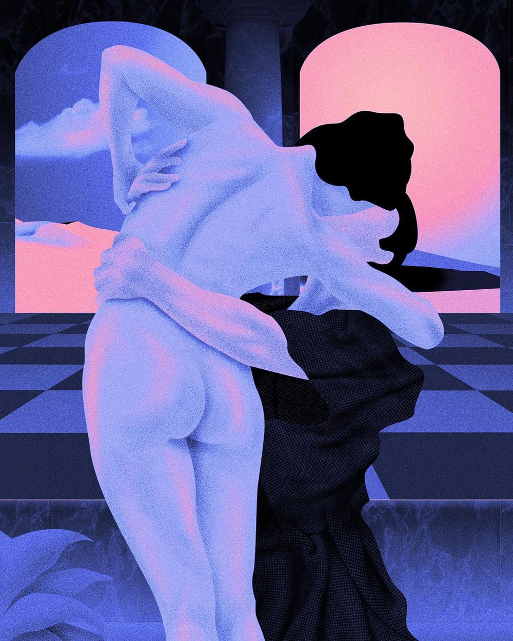 Magenta, blu elettrico, più raramente rosso o verde. Si serve di pochi colori Hugo Devoucoux, che con le sue opere ci porta dentro a un immaginario erotico che lascia molto spazio all’immaginazione. I protagonisti sono corpi nudi di uomini e donne, appena accarezzati dalla luce, che si fondono l’uno nell’altro a figura intera o mostrando solo alcuni dettagli, in un’atmosfera di grande intimità.