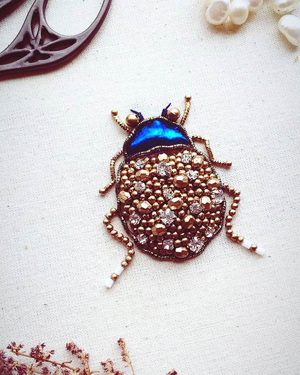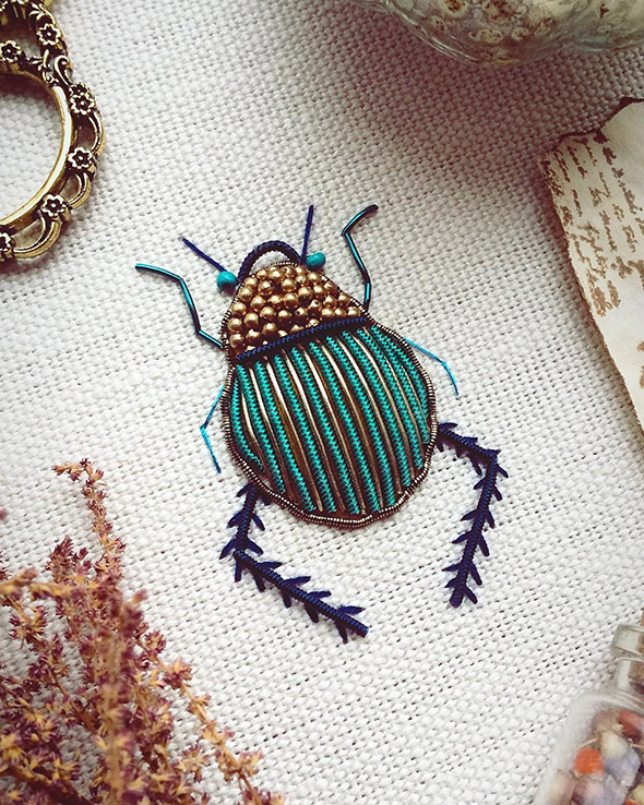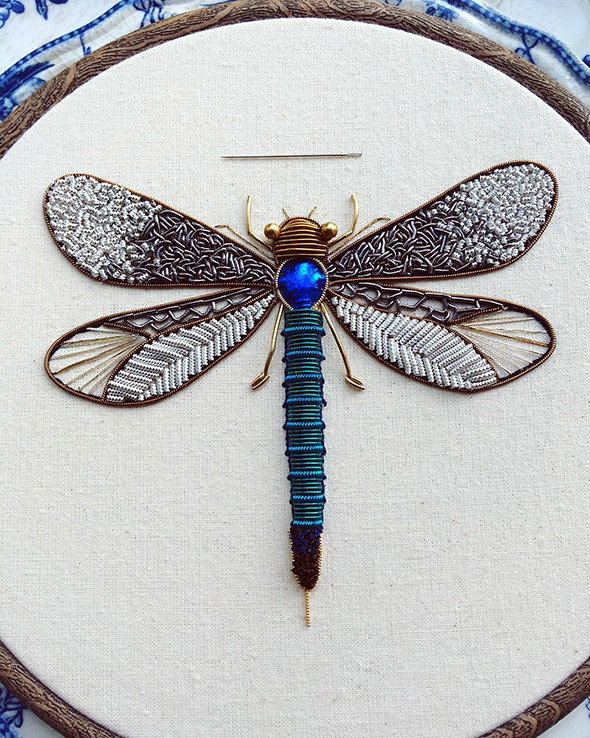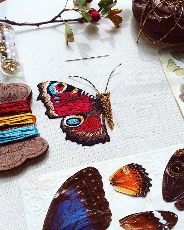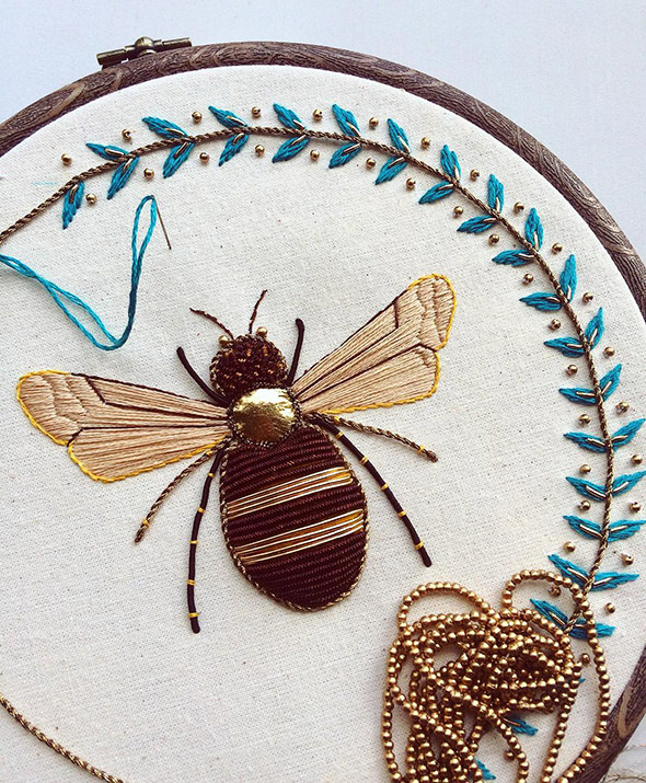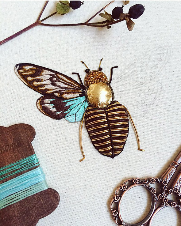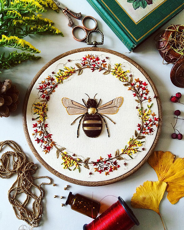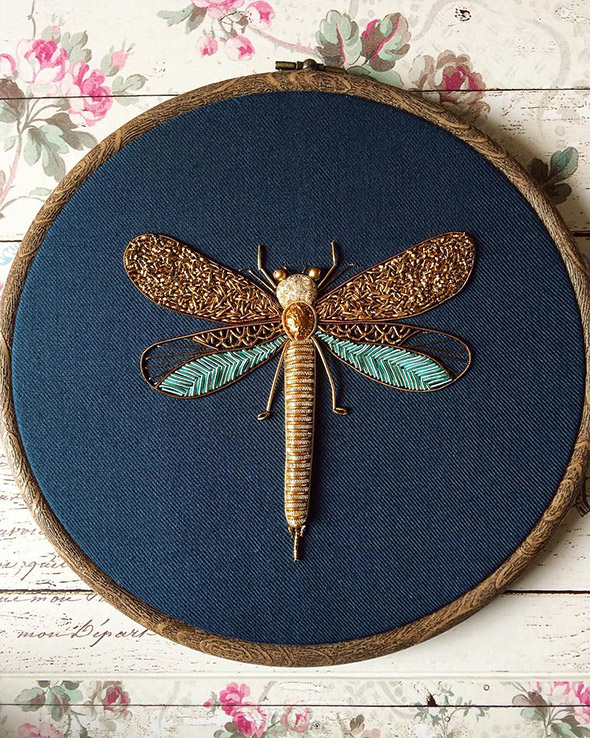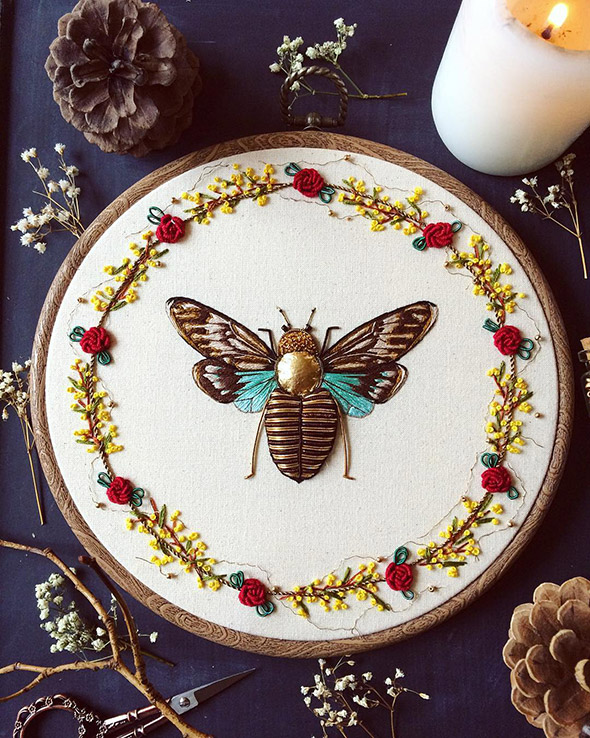 E come darle torto. Del resto basta scegliere a caso uno dei tanti lavori a tamburo per capire che il suo talento, enfatizzato dalla cura maniacale per i dettagli, è qualcosa di fuori dal comune. Mi hanno colpito in modo particolare gli insetti, le cui fattezze e sfumature sono già in natura incredibilmente complesse. Humayrah li riproduce alternando fili di colori differenti e inserti come pezzi di stoffa e metallo. O ancora piccoli oggetti raccolti nei boschi attorno al luogo in cui vive: foglie, fiori, piume, ramoscelli. L’artista li definisce “tesori”, li raccoglie e li custodisce come tali nel suo laboratorio per poi includerli nei ricami.