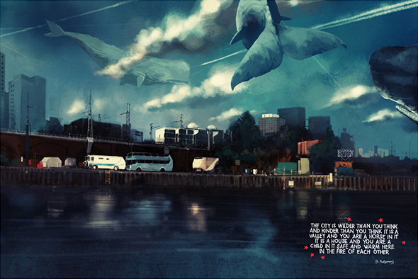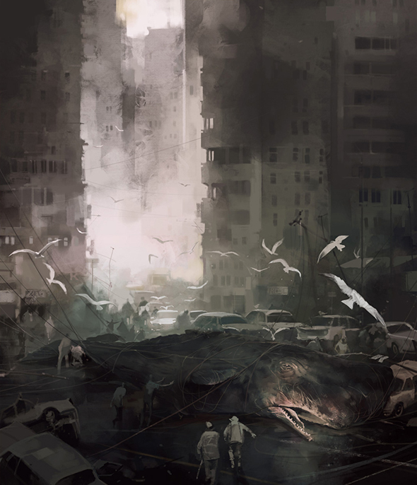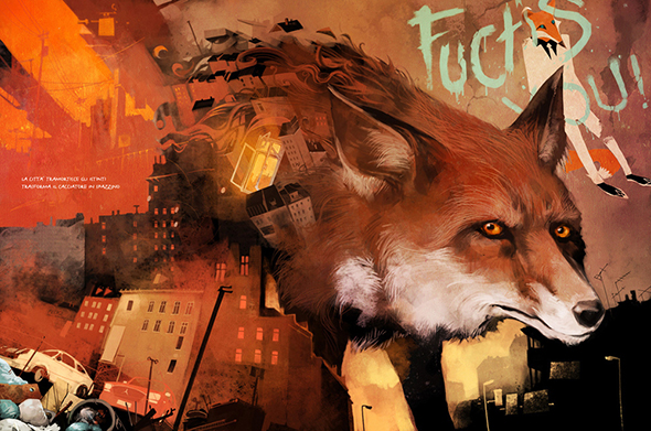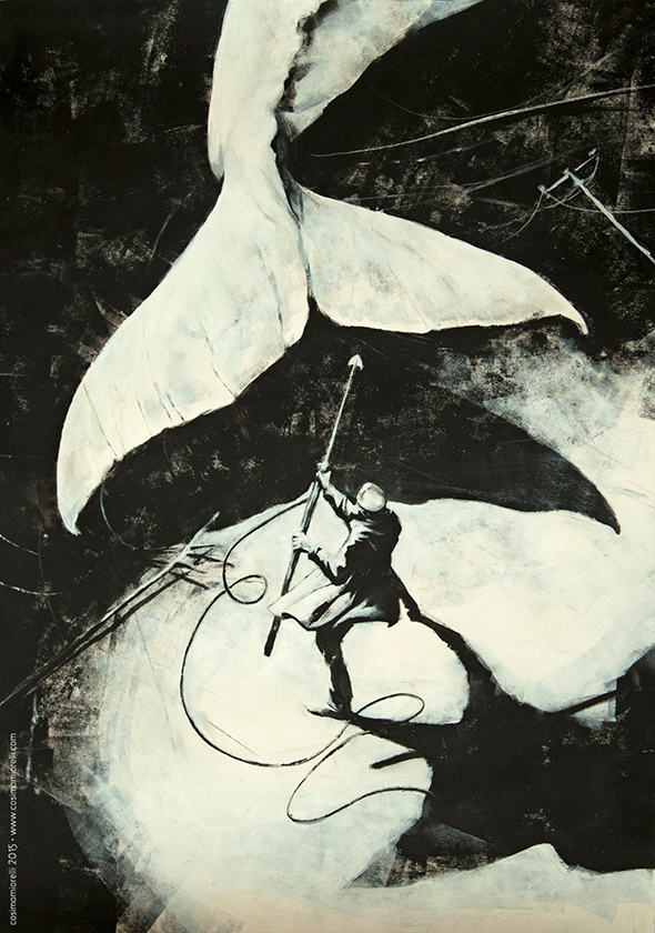 Illustratore, pittore, live performer. Impossibile non subire il fascino dei lavori di Cosimo Miorelli, artista che si discosta dal taglio editoriale che siamo soliti preferire, ed invade le nostre pagine con immagini potenti, portatrici di storie che desideriamo scoprire. Cosimo ha illustrato libri (“Trentaduedentirotti” e “Athos. Appunti dalla Montagna Sacra”, entrambi pubblicati da Grifo Edizioni / Edizioni Di), vignette per il quotidiano di Berlino “Il Mitte” e, ultimamente, sta investendo tempo ed energie nelle performance che lo vedono, pennelli in pugno, esibirsi dal vivo nella creazione di dipinti digitali. Su tutto dominano i capodogli fluttuanti “che sono un’ossessione alla quale sto cercando di porre fine con un grosso lavoro esorcizzante”. Lavoro che sembra non stia funzionando, vista la natura del protagonista dell‘header che Cosimo ha realizzato per noi. Non ci dispiace nemmeno un po’!