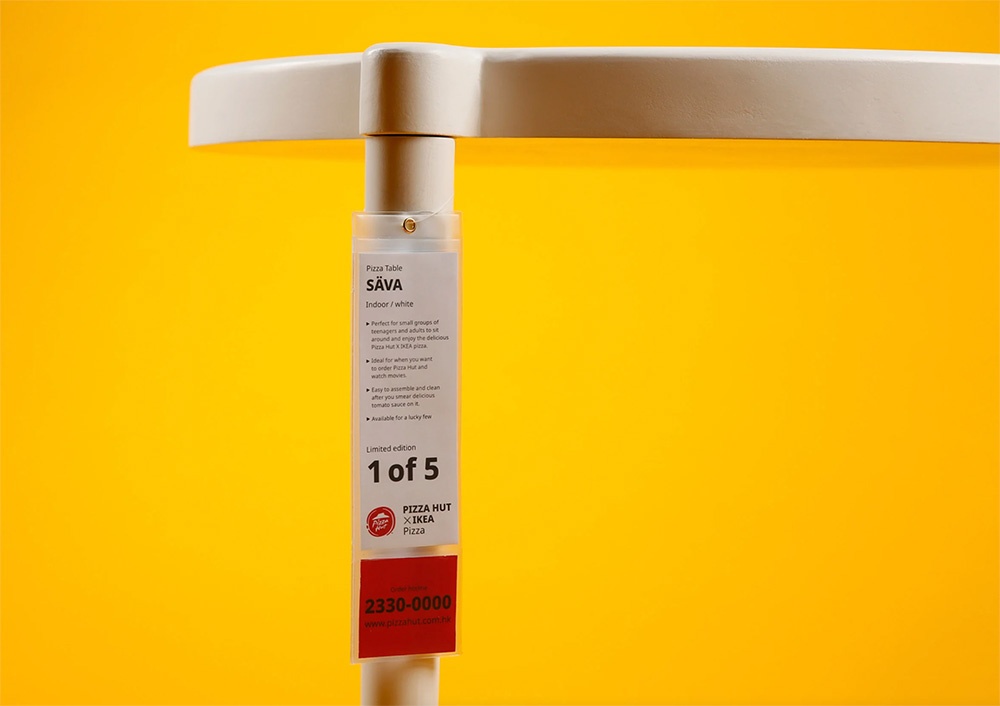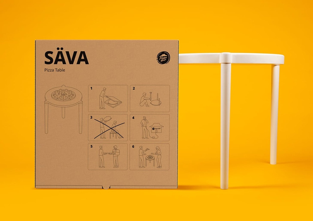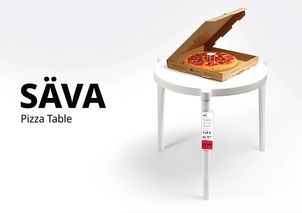 SÄVA è composto da quattro pezzi in tutto, tre gambe più un ripiano che reca il logo Pizza Hut al centro, tutto rigorosamente in plastica bianca e venduto nel classico packaging havana dell’azienda svedese, che per l’occasione assomiglia molto a un maxi cartone per la pizza. Puzza Hut, per ricambiare il favore, ha inserito nel menù una pizza condita con le celebri polpette dell’IKEA (ma solo in Cina, per il momento).