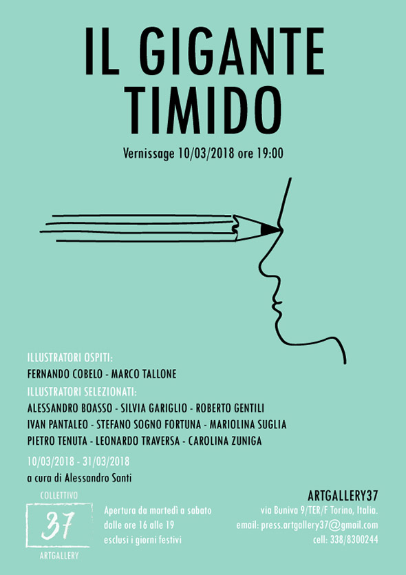 Fino al 31 marzo all’Artgallery 37 di Torino potete visitare Il Gigante Timido, mostra che apre un ciclo dedicato all’illustrazione allo scopo di promuovere il lavoro di giovani artisti italiani. Alessandro Santi, organizzatore e curatore, racconta:
