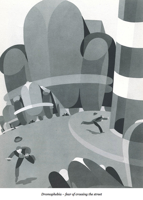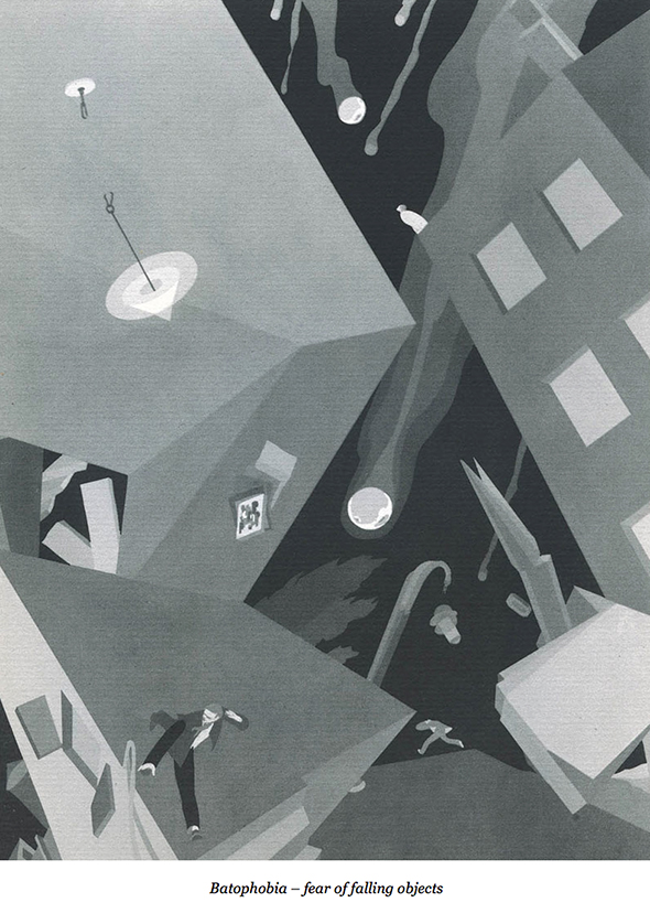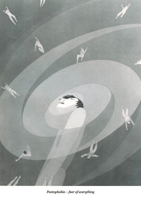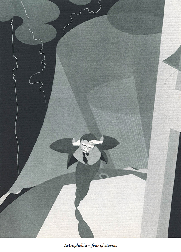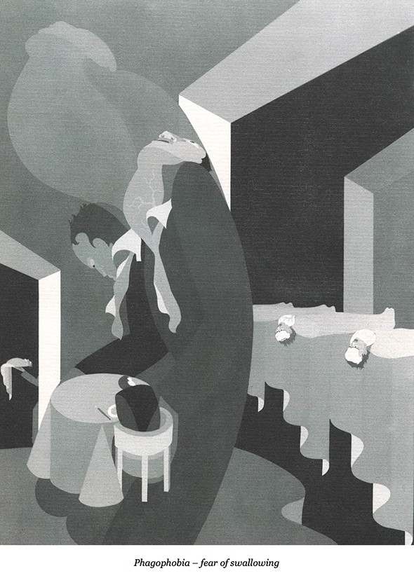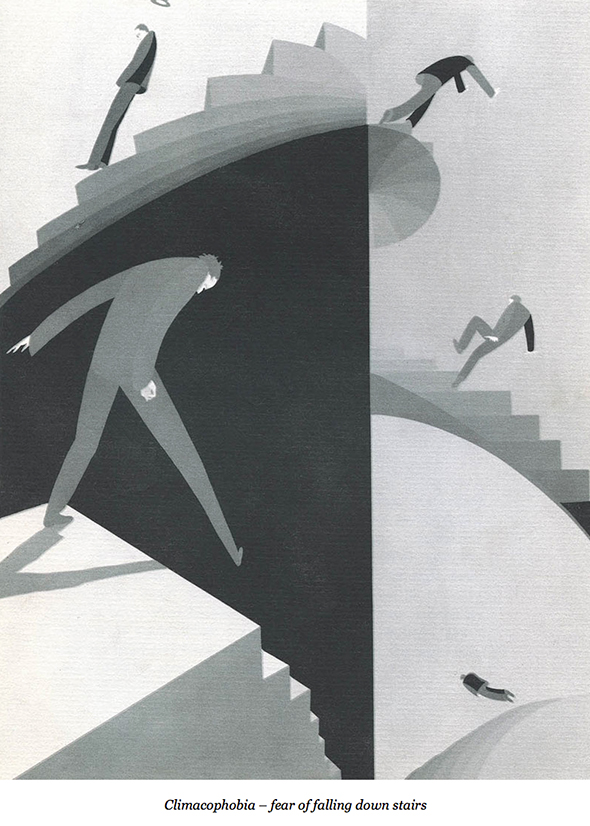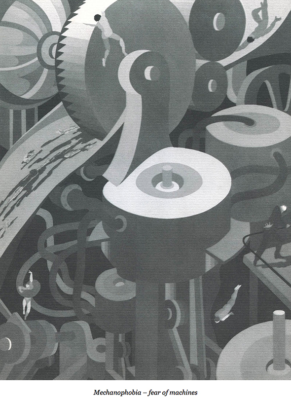 John Vassos è stato un famoso designer ed illustratore, nato in Romania e successivamente trasferitosi a New York. In seguito ad una brutta depressione, durante la quale fu seguito e curato dal celebre psichiatra Henry Stack Sullivan, produsse una serie di illustrazioni dedicate a paure umane più o meno comuni; dalla Claustrofobia, che tutti conosciamo, alla Meccanofobia, ovvero il terrore nei confronti delle macchine e, più in generale, della moderna industrializzazione. Gli originali di queste opere furono stampati con un procedimento litografico brevettato nel 1915 da Hugo Knudsen, inventore del processo halftone, in uso ancora oggi.