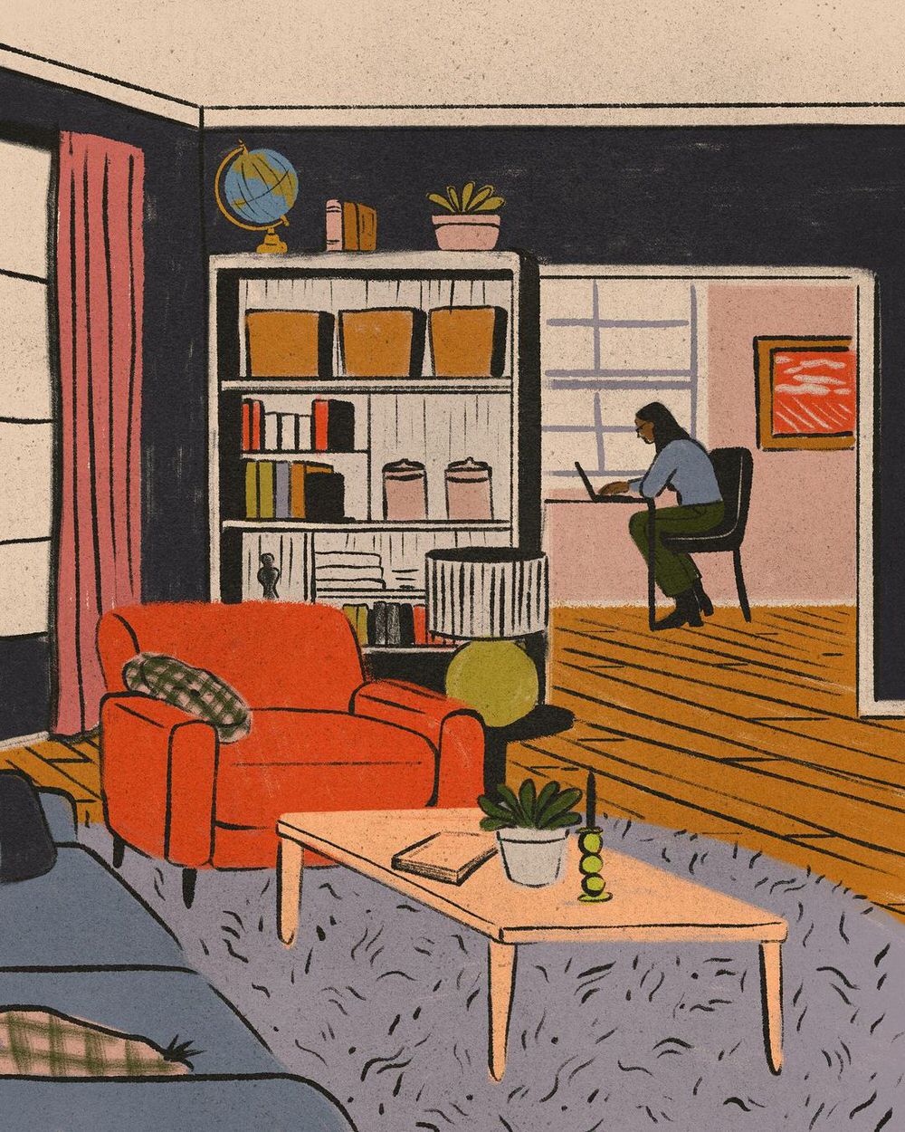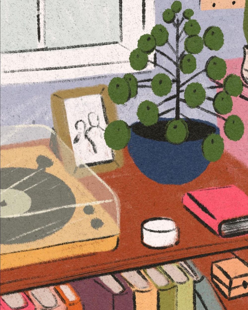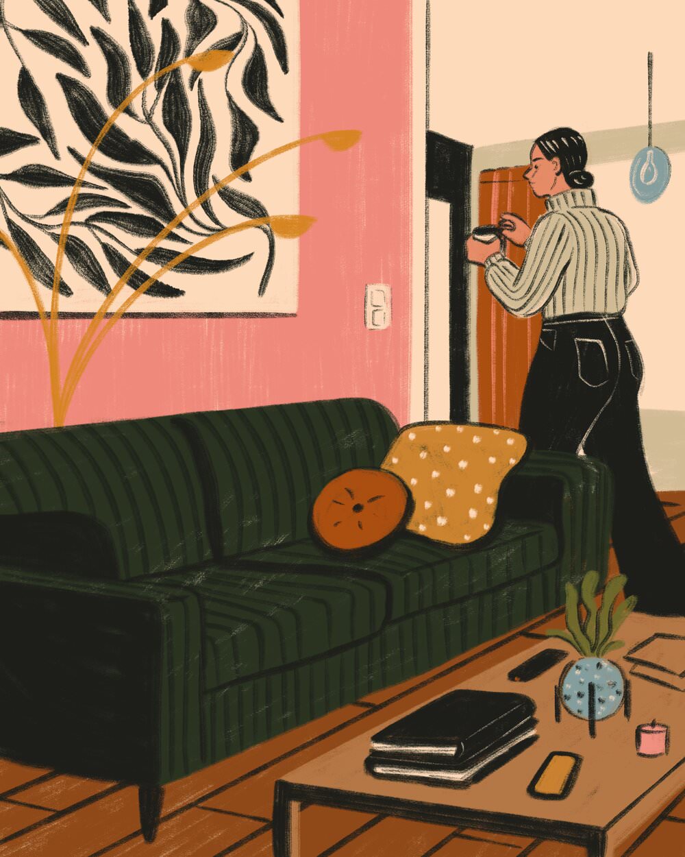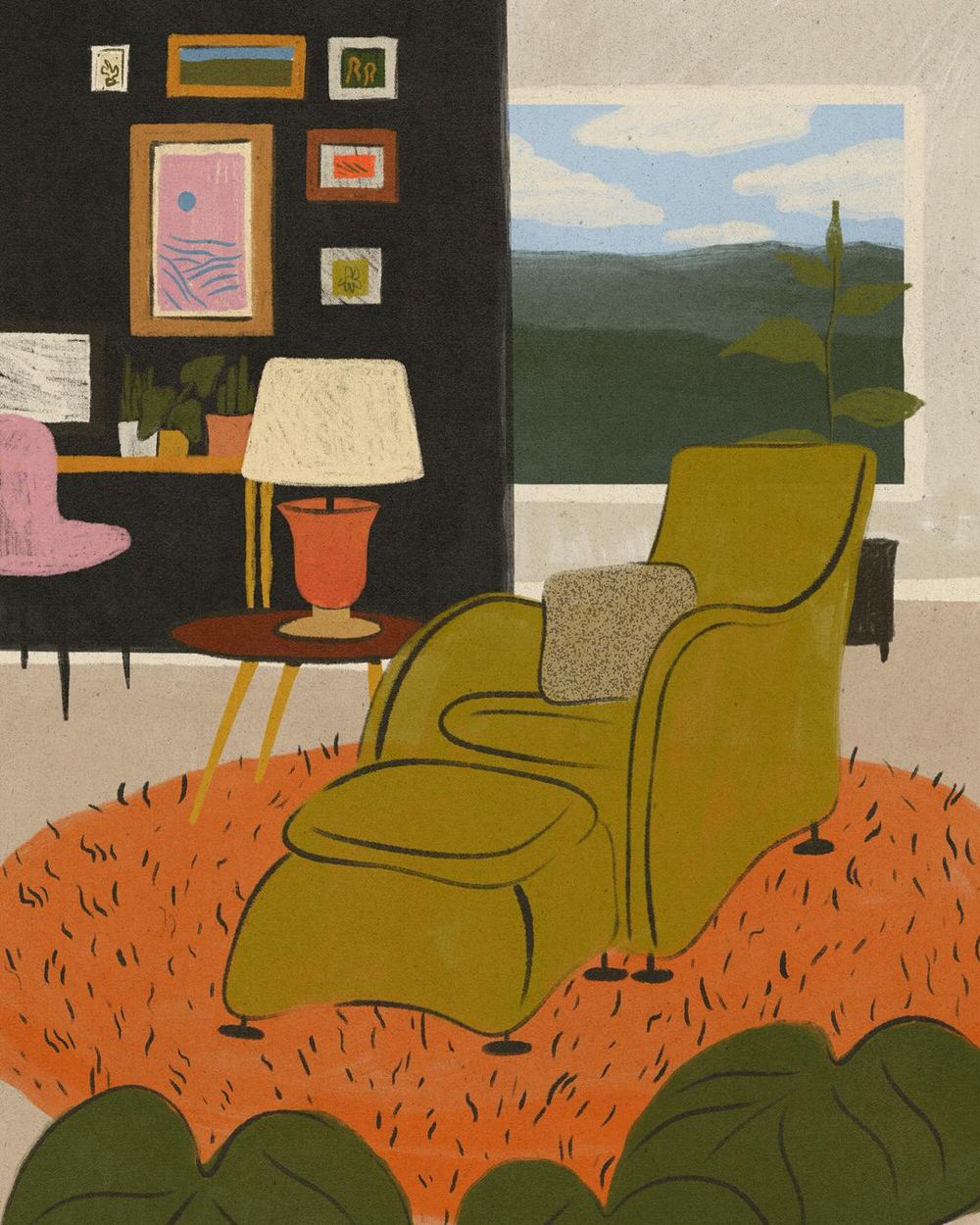 Le illustrazioni, per lo più digitali ma anche a matita, inchiostro e acrilico, sono fatte di pennellate morbide e colori caldi, ricche di particolari. Le serie dedicate agli interni delle case riportano con estrema precisione ambienti che ci sembra quasi di riconoscere, così come i protagonisti che li abitano, ed evocano momenti di vita vissuta in cui è facile immedesimarsi. Prendetevi una breve pausa per fare un giro su suo Instagram e sul sito, che ospita anche uno shop in cui è possibile acquistare le sue stampe.