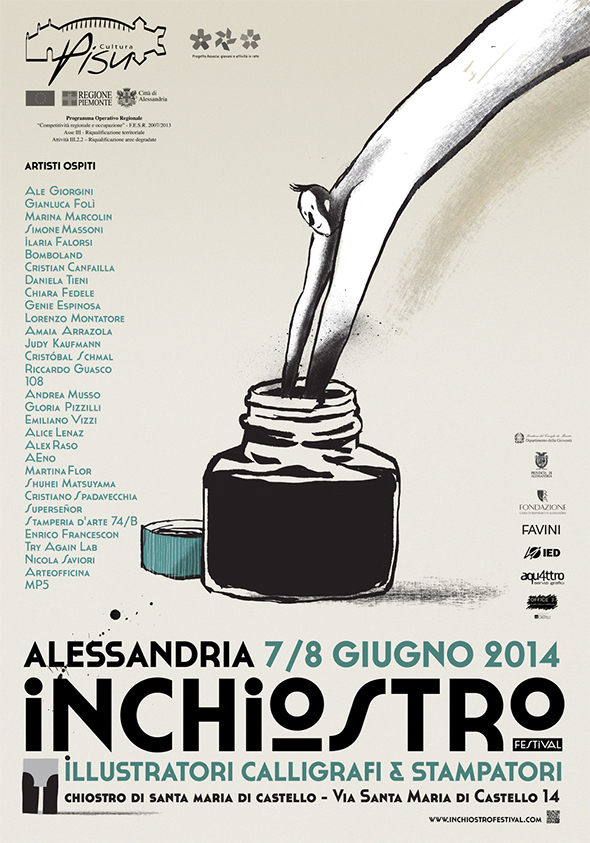Al via questo weekend (7/8 Giugno) la 2° edizione di Inchiostro Festival, il che ci rende felici per tutta una serie di motivi. In primis, perchè va ad aggiungersi ai sempre più numerosi eventi dedicati all’illustrazione italiana. Poi perchè si svolge ad Alessandria, che è casa nostra, in una location assai suggestiva come il Chiostro di Santa Maria di Castello. Poi perchè il roster degli illustratori coinvolti è vasto e comprende alcuni amici di PICAME come Ale Giorgini, Gloria Pizzilli e Riccardo Guasco, che ci farà enorme piacere rivedere.