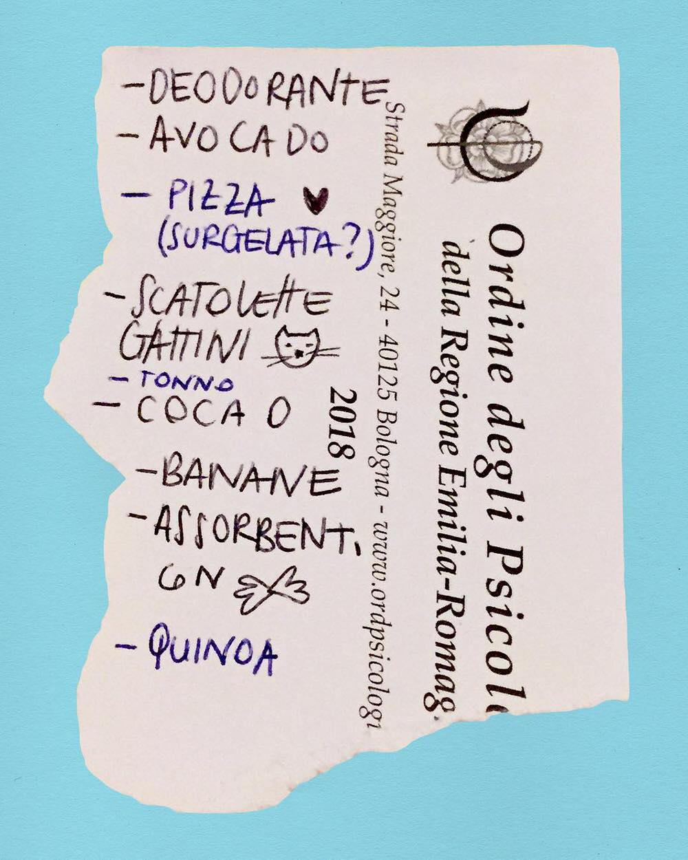 È una domanda molto bella, perché io non faccio liste della spesa in verità, è questa la cosa assurda. È un po’ come quando dici che a casa del falegname le sedie traballano! Però, se dovessi farne una, metterei sicuramente come elemento prioritario la curiosità. Questa ricerca ossessiva di liste della spesa nei supermercati parte da questo e anche da una mia indole a ficcare il naso nella privacy altrui, in modo assolutamente buono e non cinico. Le liste sono per me un’occasione per sbirciare in una delle zone più intime della casa, e cioè la cucina, la dispensa.