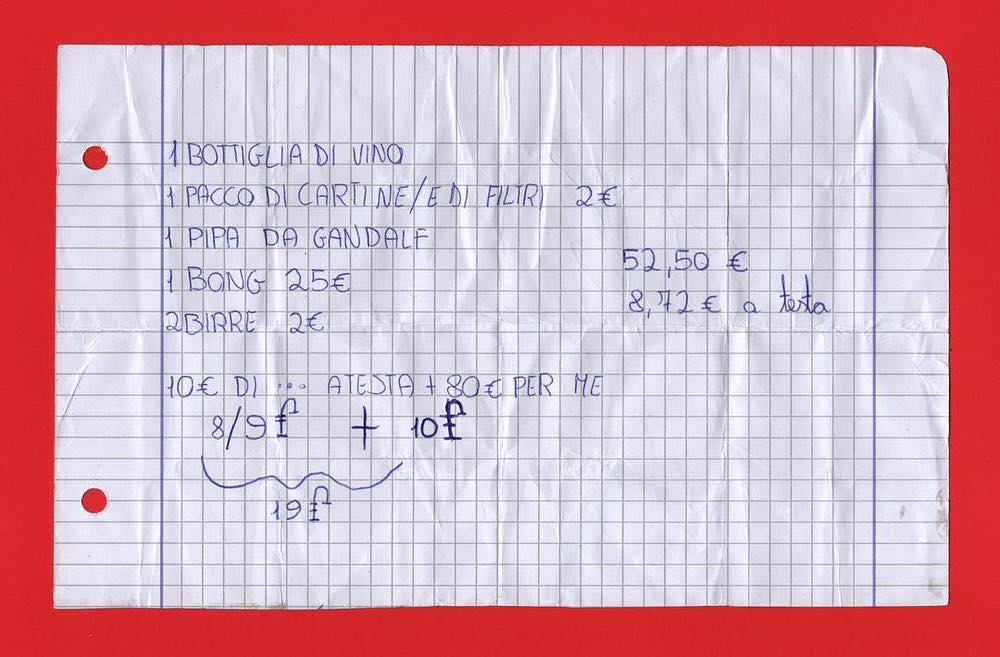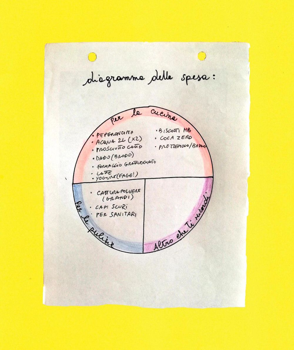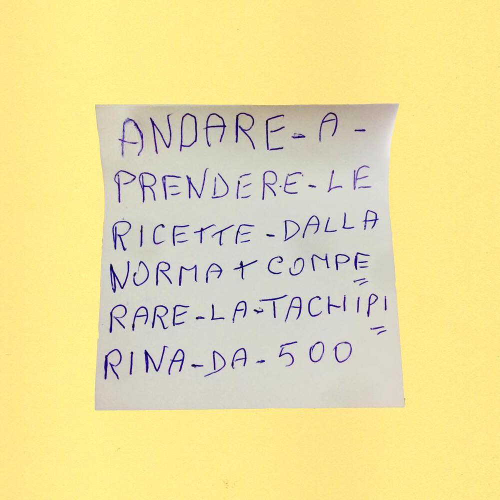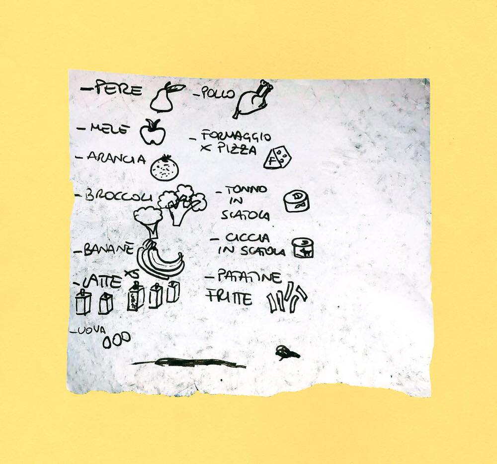 Coinquilini, perché si percepisce del disagio: c’è tantissima pasta col tonno, alcool e prodotti più o meno illegali. Poi ci sono le liste delle famiglie, che sono quasi tutte legate al lockdown, e sono quasi dei fogli protocollo, visto che la spesa in quel periodo raddoppiava, triplicava, per cercare di soddisfare le richieste di tutti. Ne sono uscite delle piccole perle.