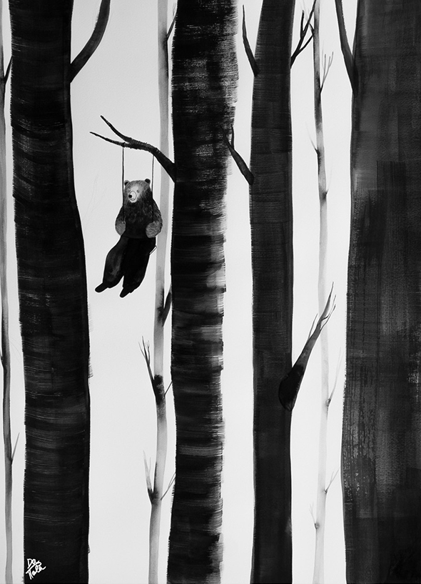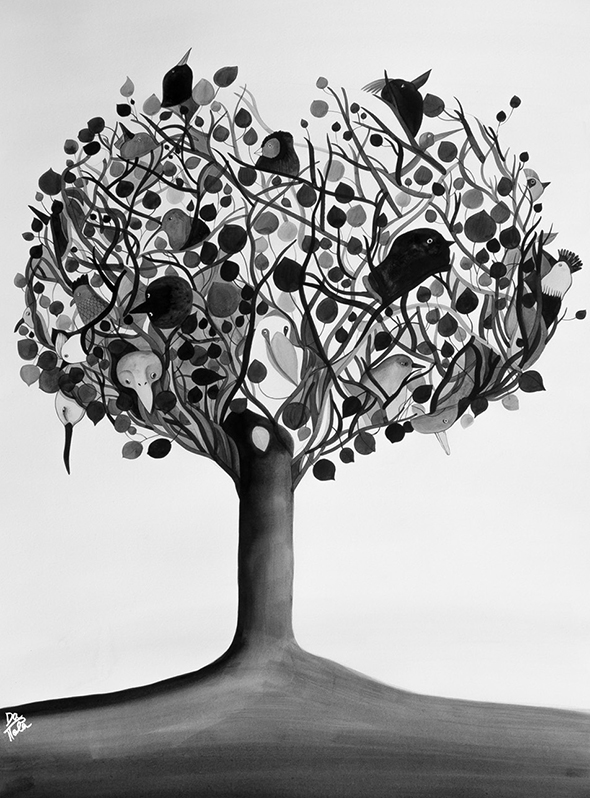 Gli esperimenti a china (anche se presento in mostra anche opere a colori e non solo collage ma anche un paio di acrilici su tela) sono stati pensati, soprattutto per focalizzare la mia attenzione sui soggetti e meno sui colori, ovviamente. Ho sempre l’abitudine di voler colpire i lettori con colori sgargianti, contrasti forti, che accolgono il soggetto dell’illustrazione e ne esaltano l’atmosfera. In questo caso volevo catalizzare le emozioni di chi guarda solo con l’aiuto del soggetto e del racconto che la linea produce quando si sgroviglia sul foglio.