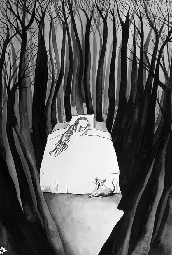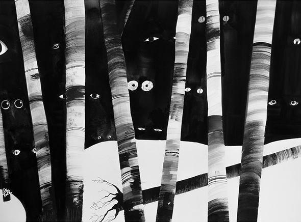 La tavola che ho realizzato per PICAME si ispira a una delle chine in mostra, quindi, dici bene: è la ventunesima. Le mie creature si nascondono nel bosco e si lasciano scorgere piano piano fra i neri e gli scuri dei fondali. Come quando andiamo in cerca di risposte e consapevolezze e le vediamo emergere, subconsce. Questa ventunesima tavola si ispira a quella china che si intitola Nell’oscurità e a una tavola per bambini che avevo disegnato tempo fa per me. Per PICAME, fra i rami di un piccolo bosco colorato, ho nascosto un solo essere silvestre molto colorato anch’esso, e curioso.