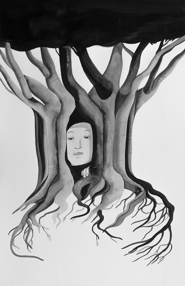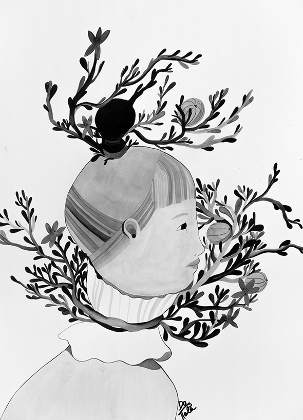 Il bianco e nero e, la china, in particolare, mi hanno sempre affascinata, sia come tecnica da sperimentare, sia per lo stesso motivo per cui mi piace la fotografia in bianco e nero: ricorda sempre un periodo lontano, prezioso, come risalente alle nostre radici di esseri umani. E quindi ho provato.
