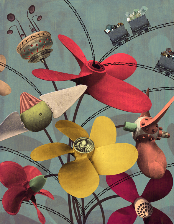 Uso quasi esclusivamente Photoshop. Le fonti dei miei collage sono soprattutto internet, vecchi libri o cartoline acquistate nei mercati dell’usato; uso anche “fondi” che dipingo e poi scansiono. Mi capita anche di disegnare le figure, acquisirle in digitale e cercare di conseguenza i “pezzi” coi quali riempirle. Mi piacerebbe in futuro tornare ad usare le matite e l’acquarello, come facevo quando ho iniziato, senza abbandonare però l’approccio “taglia e incolla” che uso di solito in fase di progettazione.