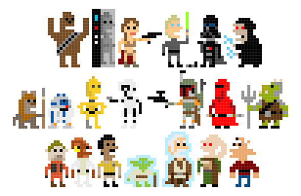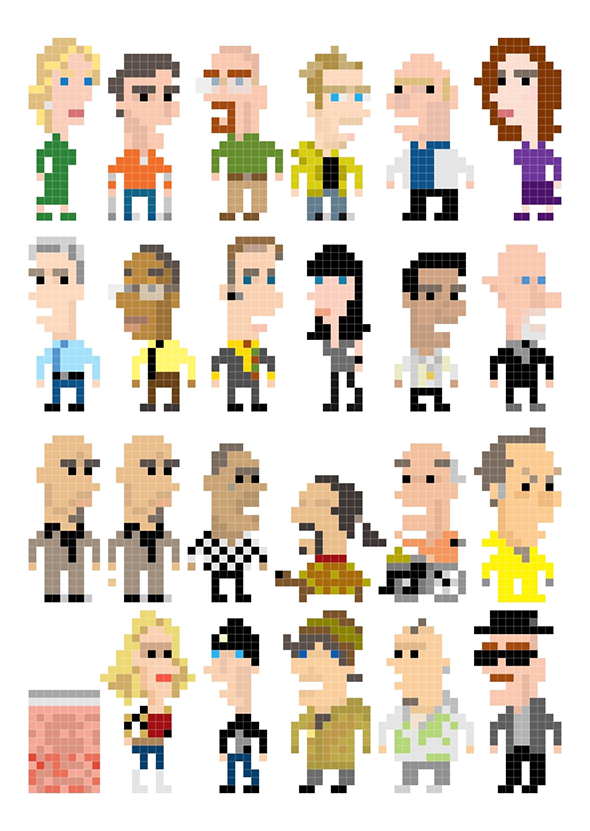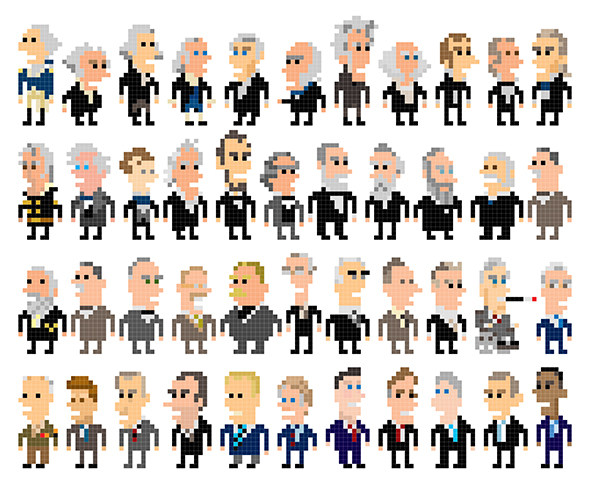 Non è della lunga lista di immagini per il New York Times realizzate dal 1996 a oggi che voglio parlare, nè dei bellissimi libri per bambini, ma di Iotacons, un progetto ispirato dalle grafiche che realizzava da ragazzino a colpi di joystick su un computer Atari, composte da pixel e letteralmente quattro colori, minimal quanto davvero poche altre cose, e che con humor descrive oggi come “very low-resolution portraits”. David Bowie in tutte le sue incarnazioni, Humphrey Bogart e Lauren Bacall, i cast di Star Wars, Star Trek e Breaking Bad, ma anche il senato americano. Non c’è celebrità o passione che non venga immortalata in un ritratto di 25 pixel, ma comunque inconfondibile.