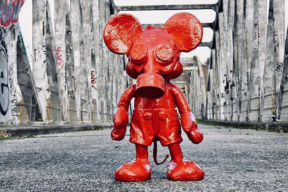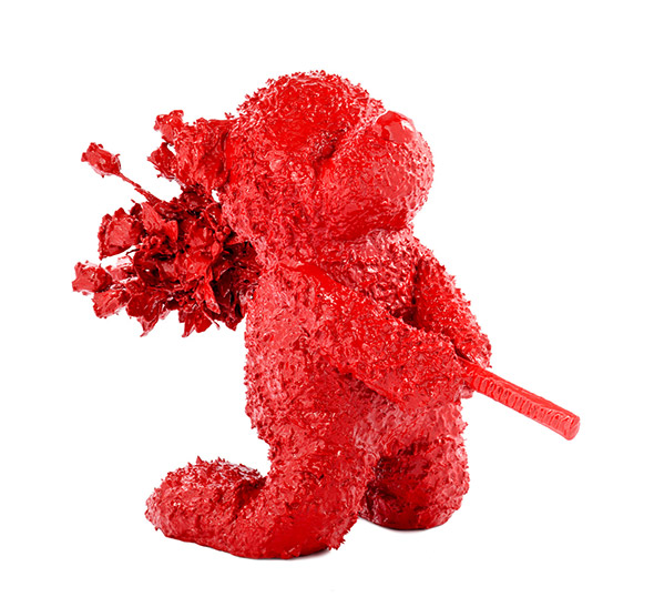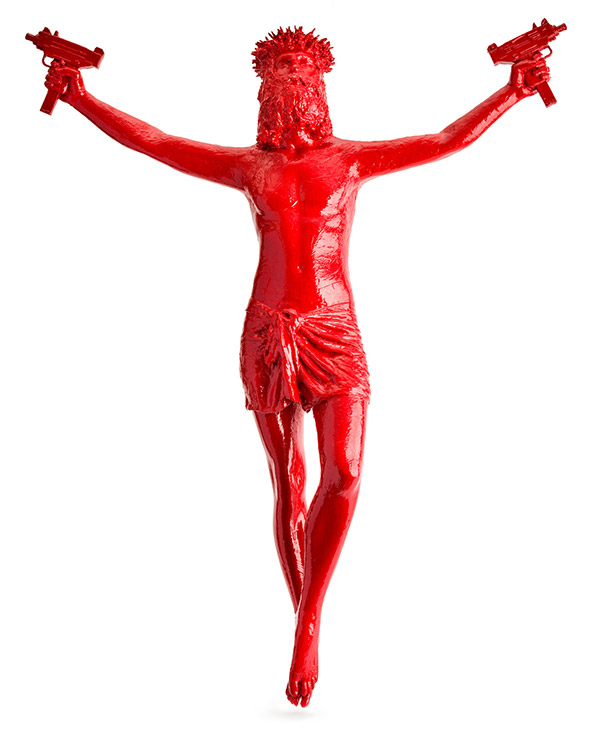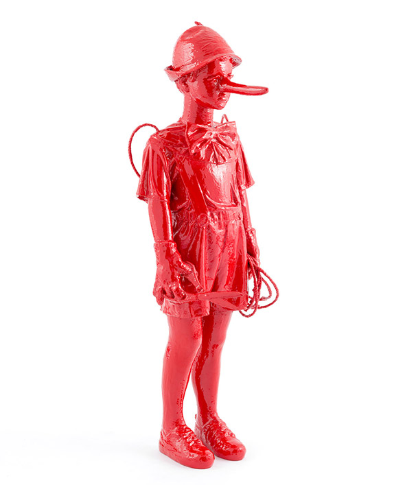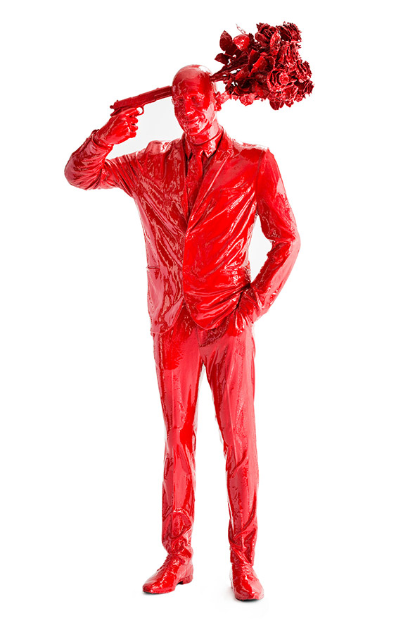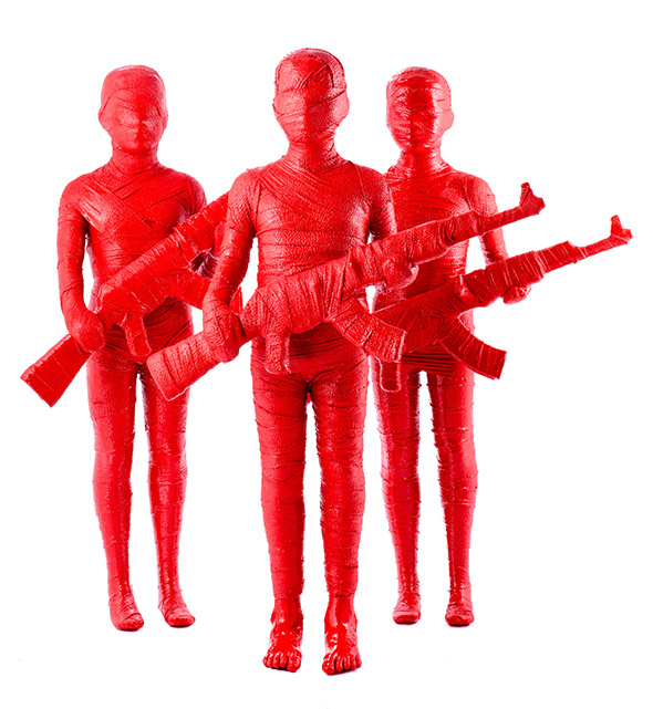Personaggi che indossano maschere antigas o che imbracciano armi, in atteggiamenti aggressivi o malinconici, tutti rigorosamente dipinti di un rosso intenso che, come un segnale di STOP, ci costringe a fermarci e riflettere.