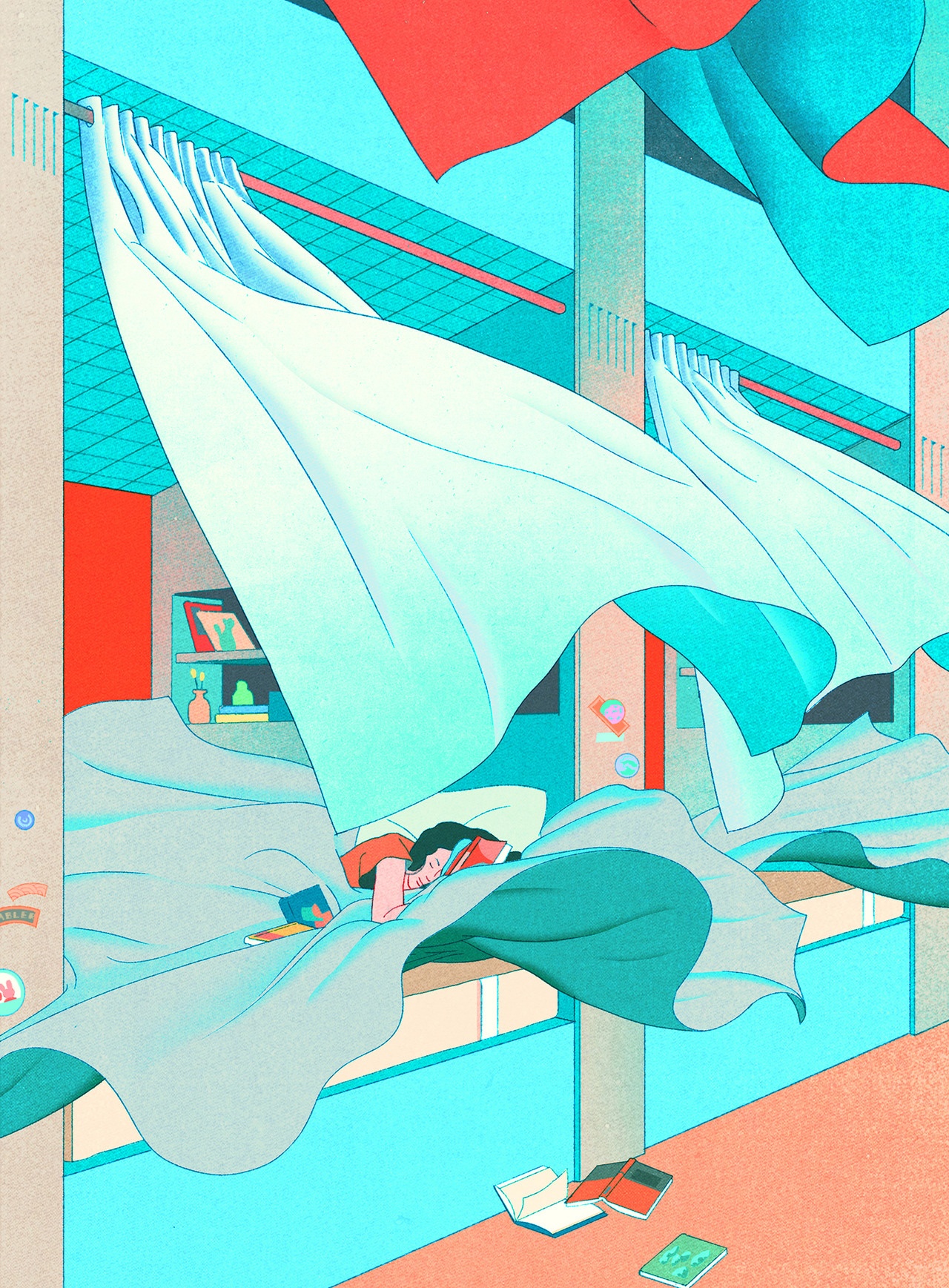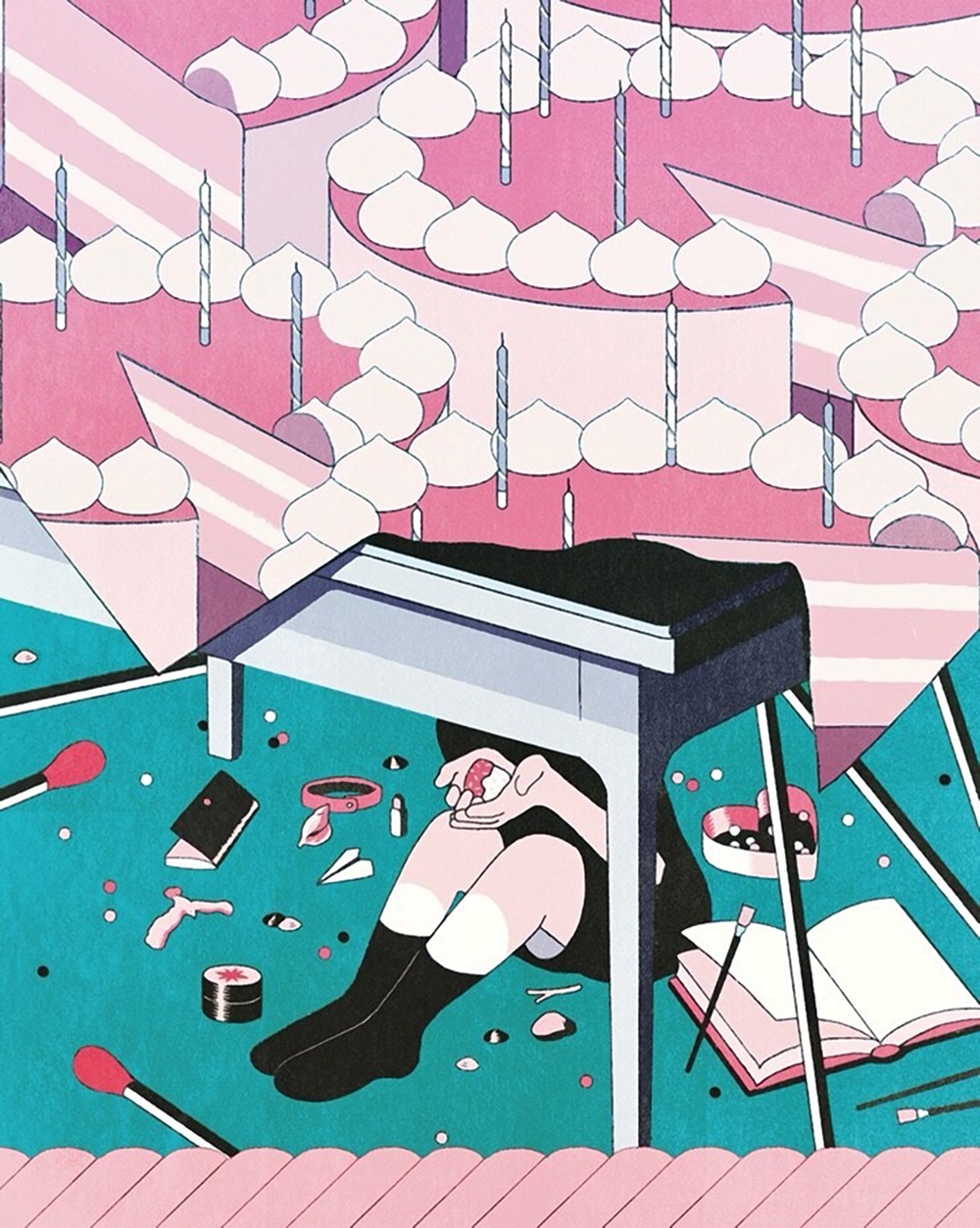 Quando cerca l’ispirazione l’illustratrice coreana immagina di camminare sospesa. In questa dimensione onirica in cui tutto è leggero e possibile prendono vita illustrazioni fatte di linee sottili e colori luminosi. Il suo obiettivo è raggiungere quella che l’autrice stessa definisce la “bellezza irreale” e trasportarci in una dimensione indipendente dalla realtà quotidiana, facendoci rivivere quel senso di meraviglia che dono un bambino è in grado di provare nei confronti del mondo che lo circonda.