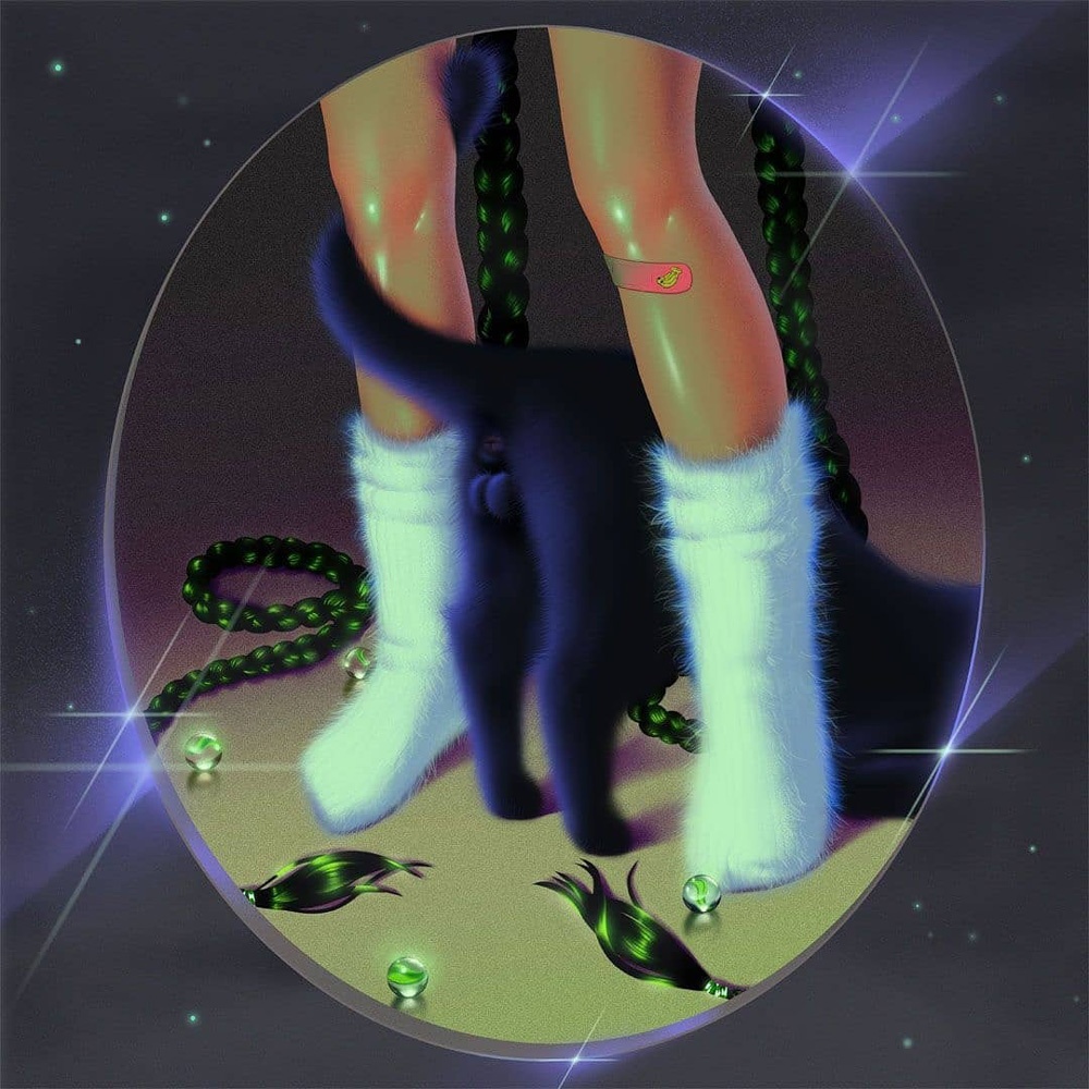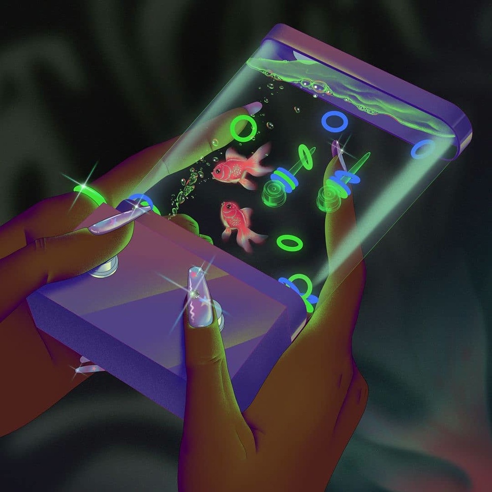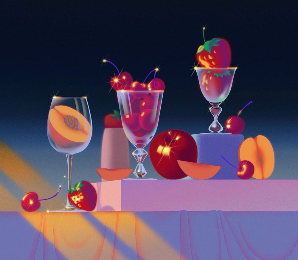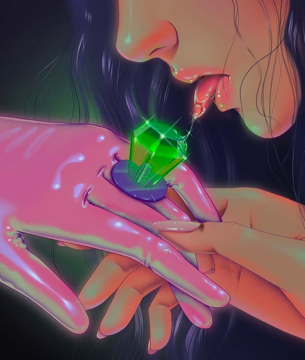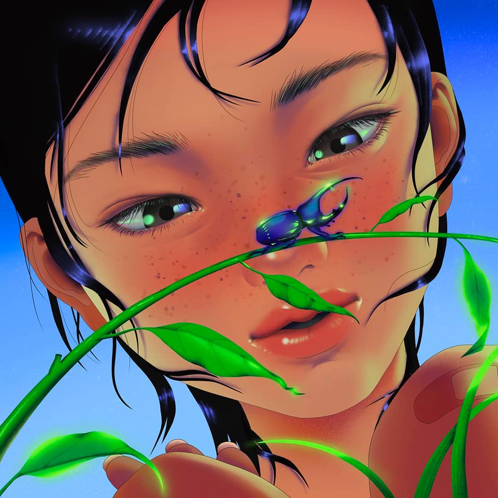 I colori fluo e lo stile iperrealistico ricordano le tavole realizzate ad aerografo dagli illustratori orientali che tanto riempivano di meraviglia chi sfogliava le pagine degli annuali di grafica negli anni ottanta/novanta.