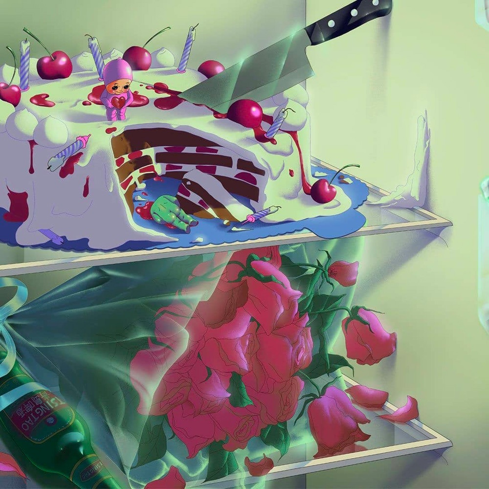 Nemmeno il cibo sfugge ai maltrattamenti dell’illustratrice: una torta accoltellata e mezza sciolta, illuminata dalla fredda luce del frigorifero, assomiglia alla scena del delitto di un compleanno finito male.