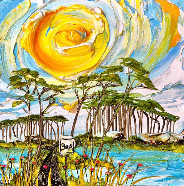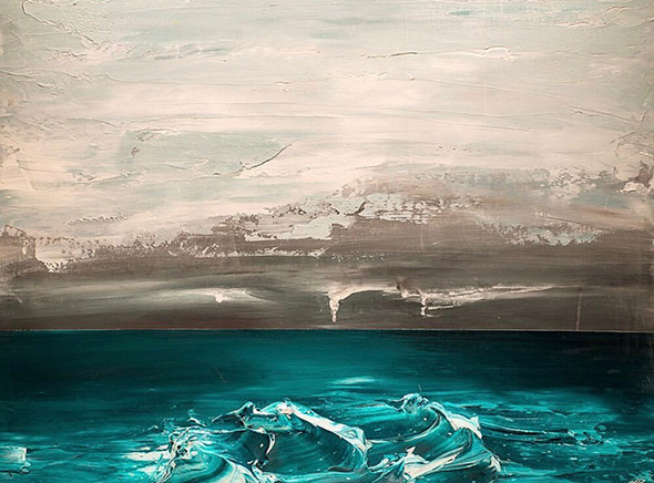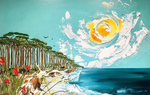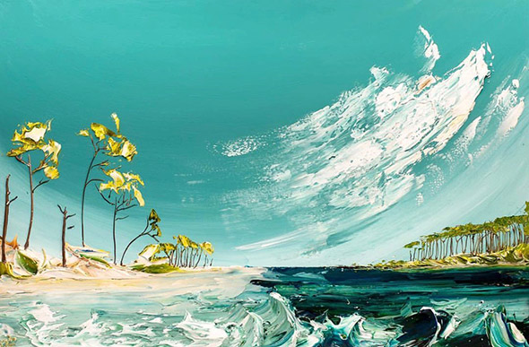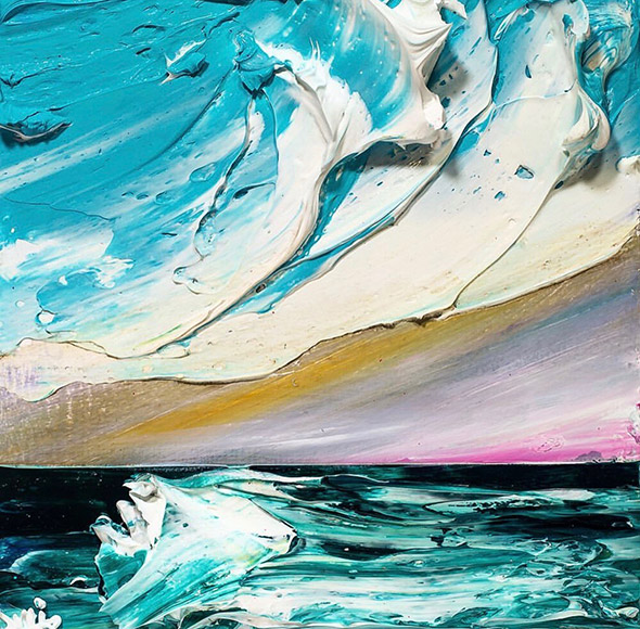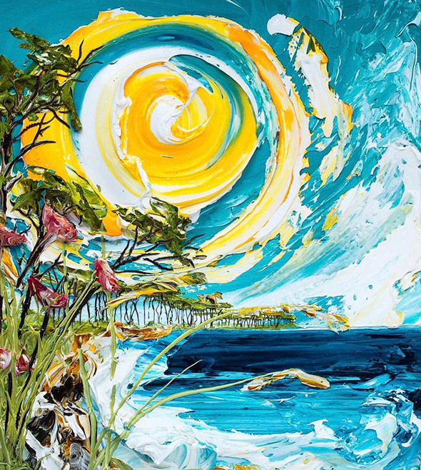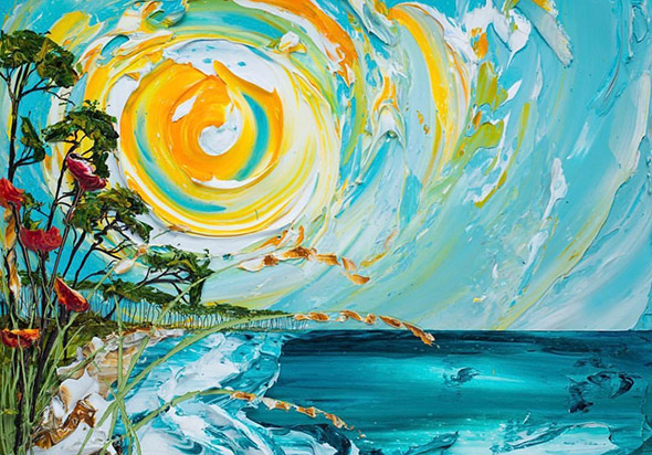 L’oceano in tempesta è uno tra i suoi soggetti preferiti. Con sapienti tocchi di bianco Justin immortala la schiuma che si forma tra i flutti e che adorna la cresta delle onde. Il risultato quasi incute timore. Il sole è un altro elemento ricorrente, ha dimensioni innaturali e irradia il suo calore sul paesaggio attraverso cerchi concentrici che ricordano quelli dei dipinti con gli ulivi di Van Gogh. La natura nel suo insieme è la principale fonte di ispirazione dell’artista e scultore americano che, a giudicare dai video che si trovano in rete, la ama tanto quanto ama giocare e sporcarsi con i colori.
