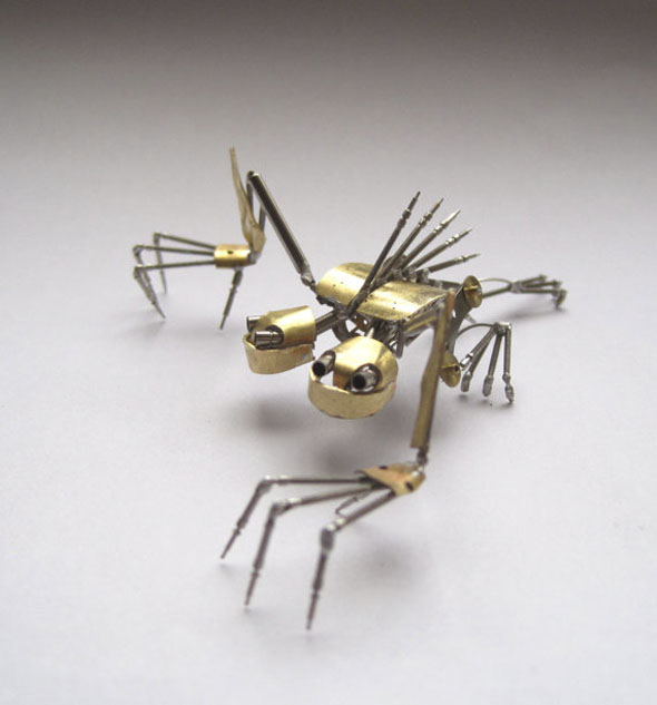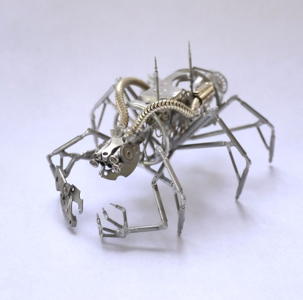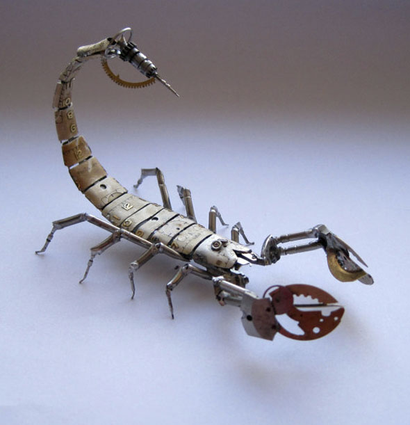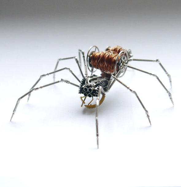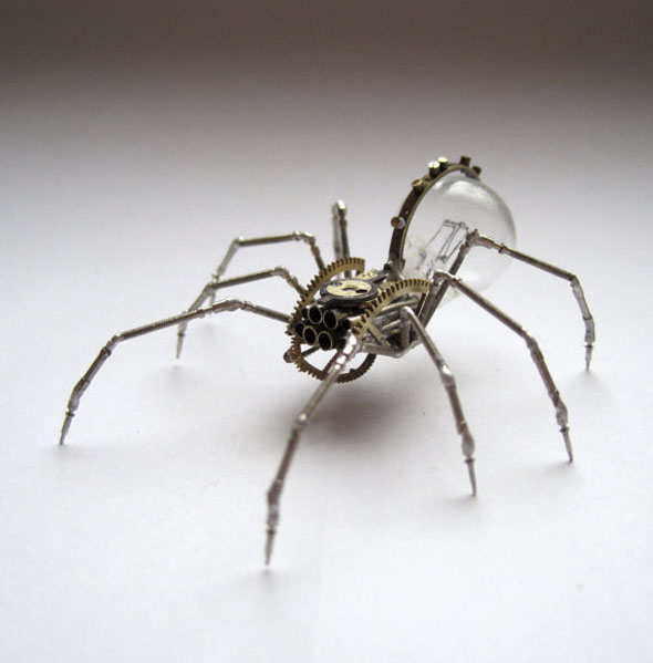 Chicago-based artist Justin Gershenson is the thinker and assembler behind A Mechanical Mind. He confesses that as a child, he liked taking his toys apart in order to see how they worked, but was never able to put them back together again. Now, he likes taking dead old watches and sucessfully rearranges their bits and widgets into whimsical designs such as these steampunk insects.