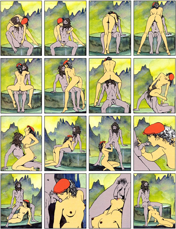 In Italia, oltre ai celebri affreschi di Pompei la diffusione di immagini erotiche ha un altro precedente storico molto popolare. Sto parlando de “I Modi” o “Le sedici posizioni”, un’opera rinascimentale che può essere considerata il primo caso italiano di scene di sesso esplicito pensate per essere commercializzate, paragonabili agli attuali comics e graphic novel. Le incisioni originali risalgono al 1524, ad opera di Marcantonio Raimondi, a sua volta ispiratosi ai dipinti erotici di Giulio Romano. Nel 1526 la serie viene accompagnata e impreziosita dai “Sonetti Lussuriosi” di Pietro Aretino. Le stampe sono state censurate e bruciate diverse volte, ma grazie alla loro popolarità sono state riprese da vari artisti fino alle soglie dell’800.