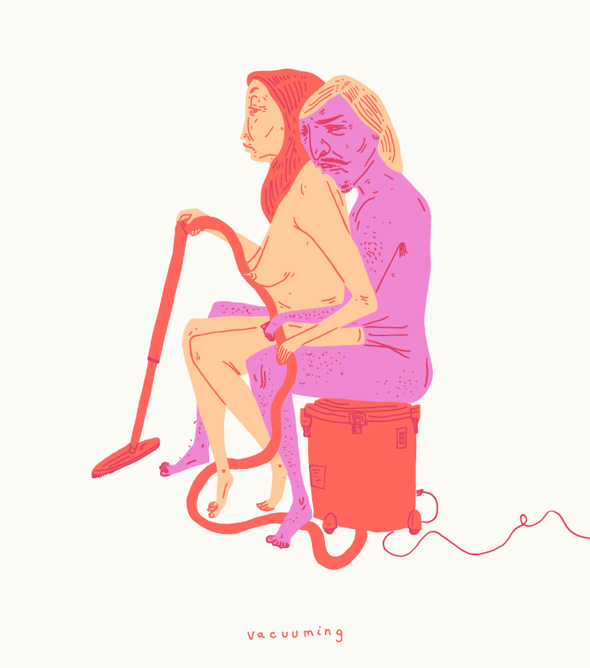 Joe Schlaud nella serie Everyday Kama Sutra utilizza uno stile underground con colori pastello per immaginare una sintesi a dir poco bizzarra tra le posizioni del Kamasutra e le faccende domestiche quotidiane. Della serie di 10 tavole esistono anche delle gif animate che rendono le illustrazioni ancora più assurde e divertenti.